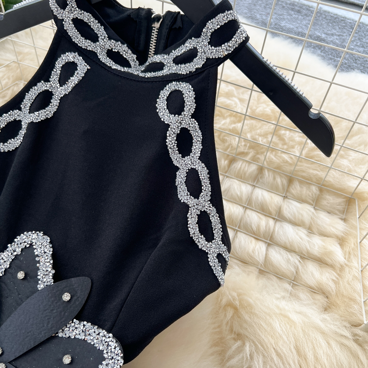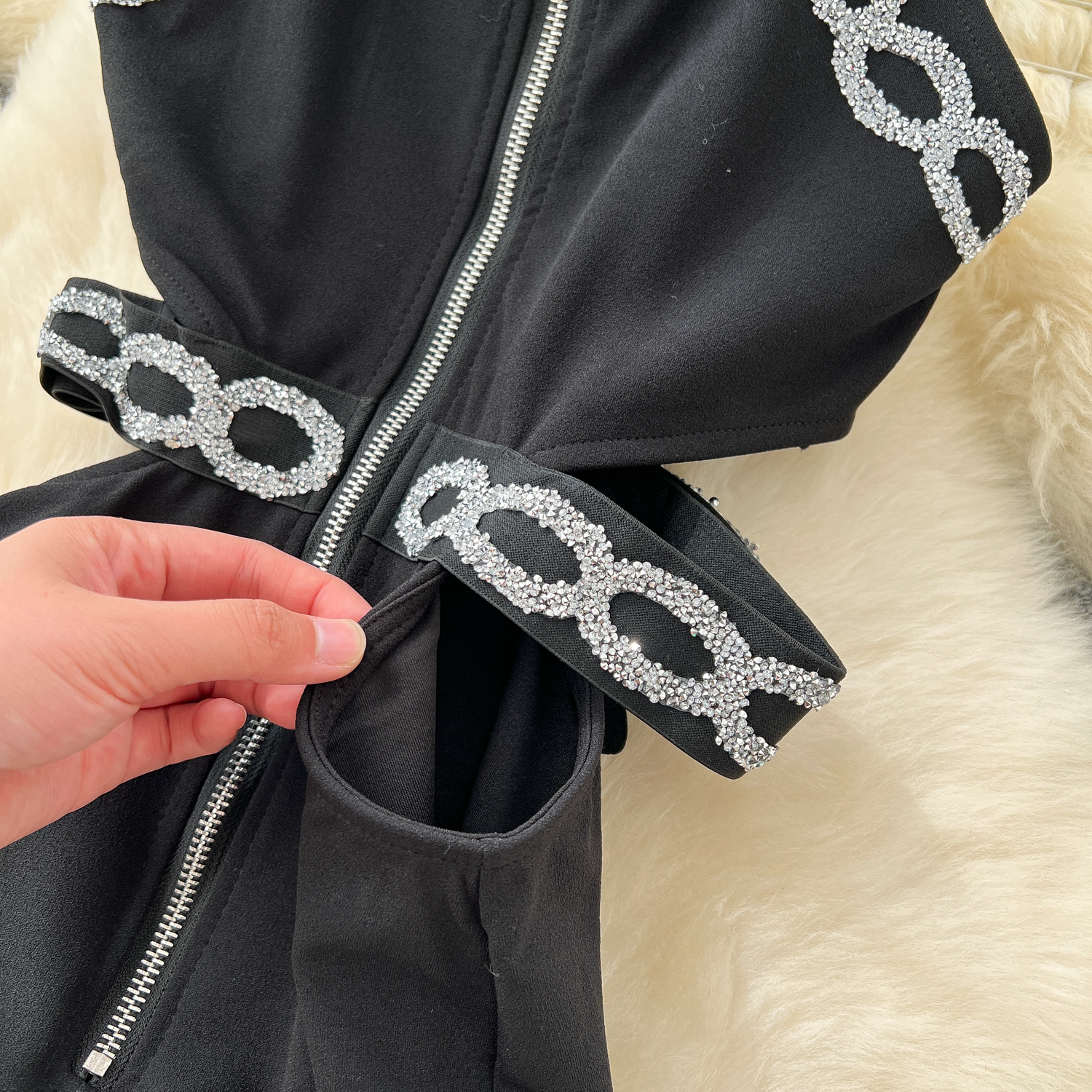 Luxurious Waist-Cinched Dress with Feminine Hollow Details and Sparkling Diamonds