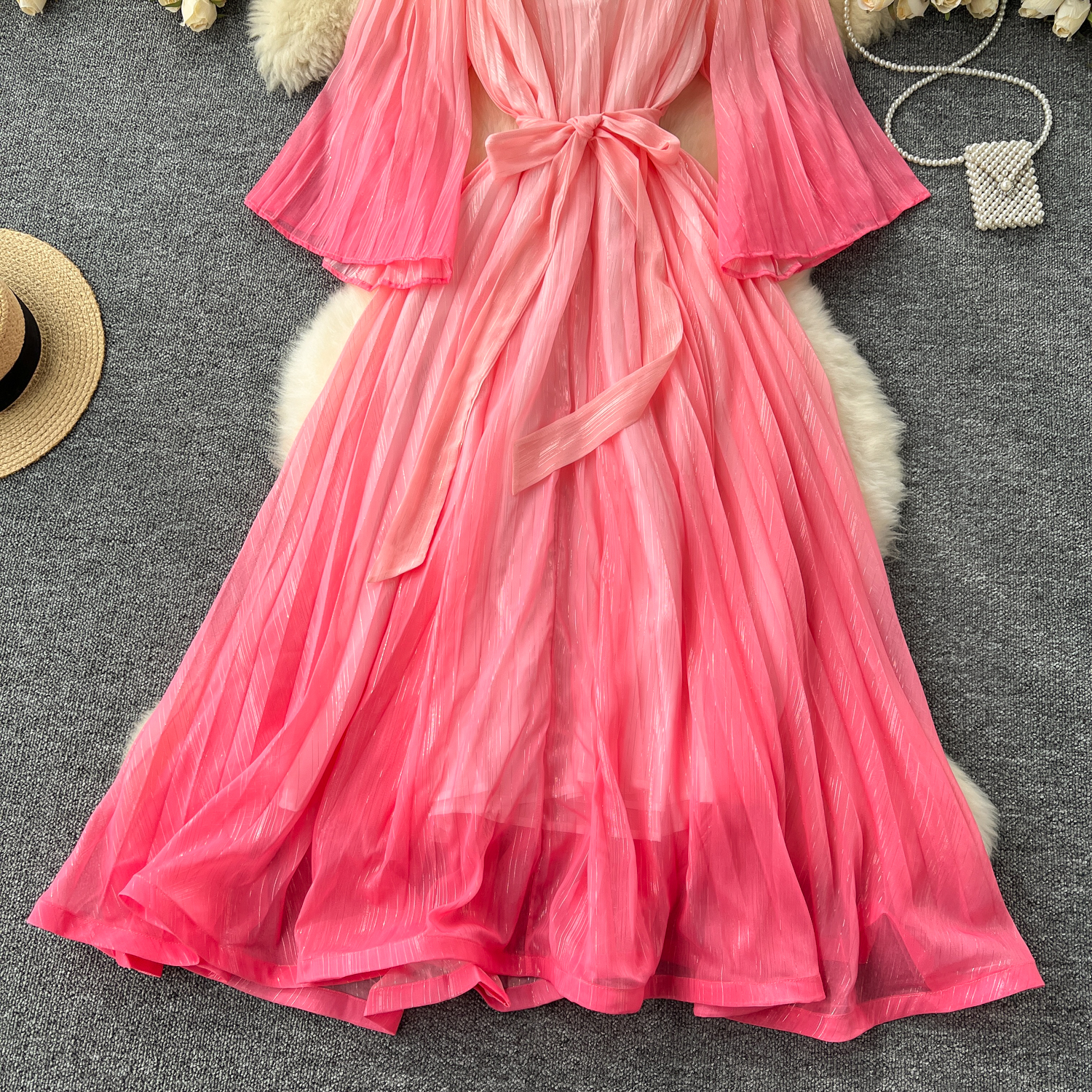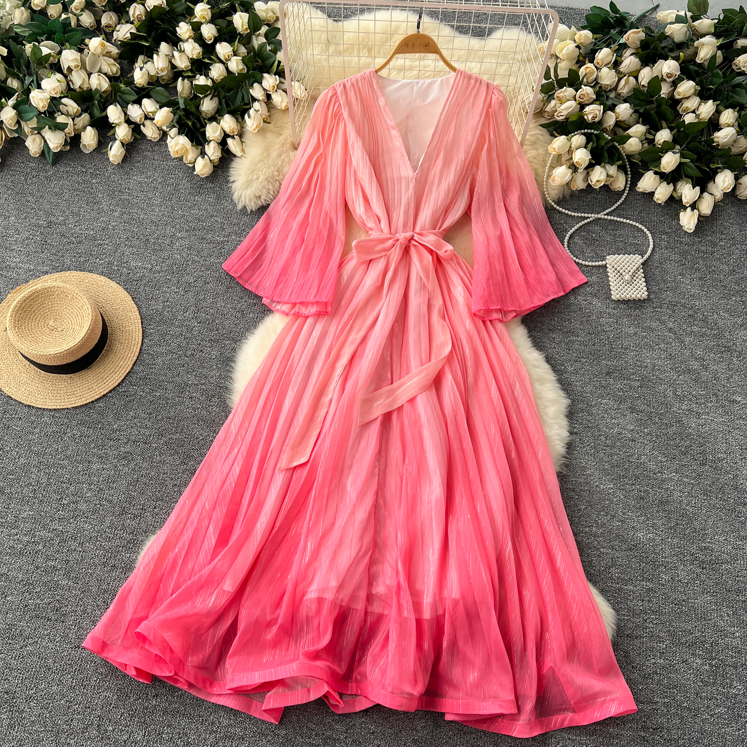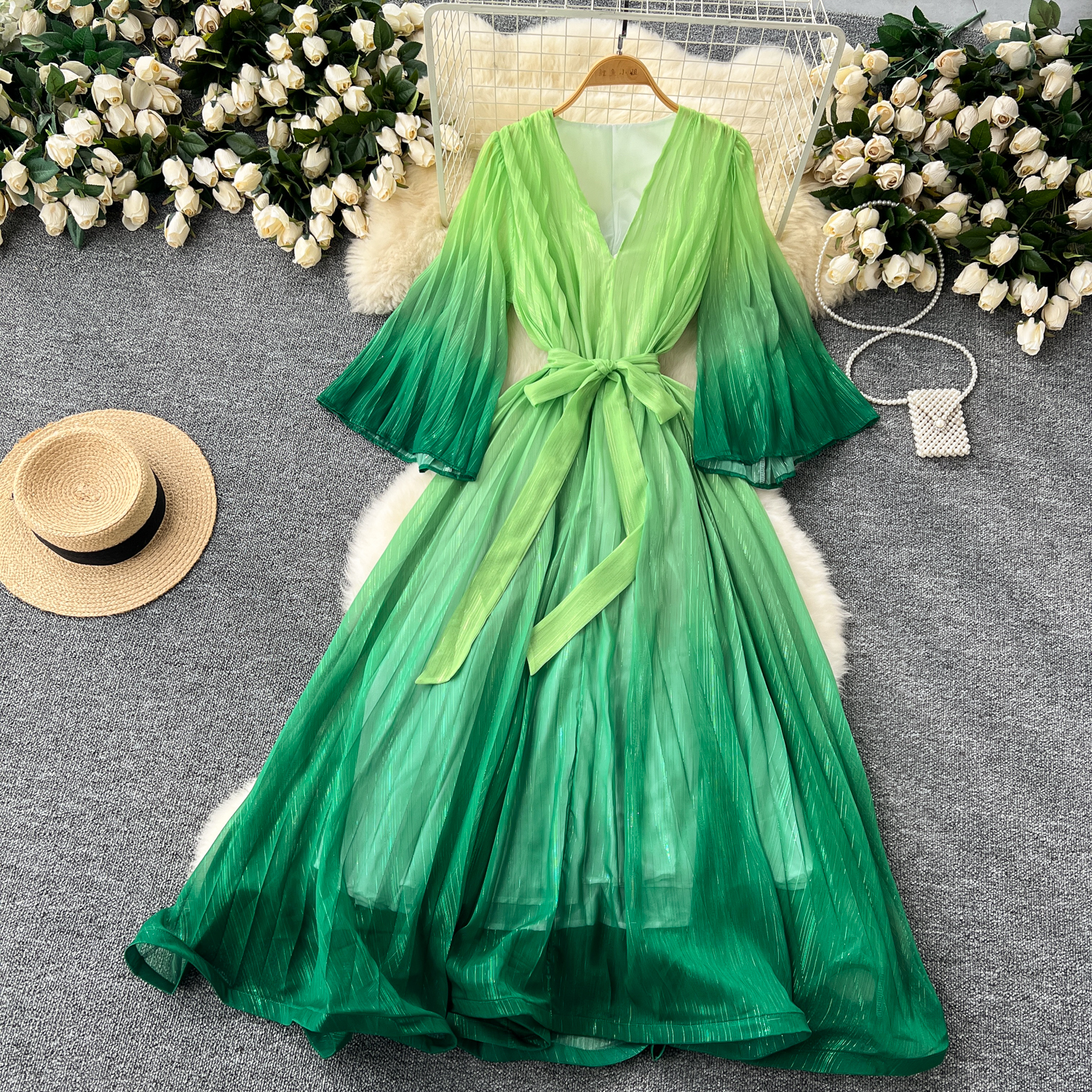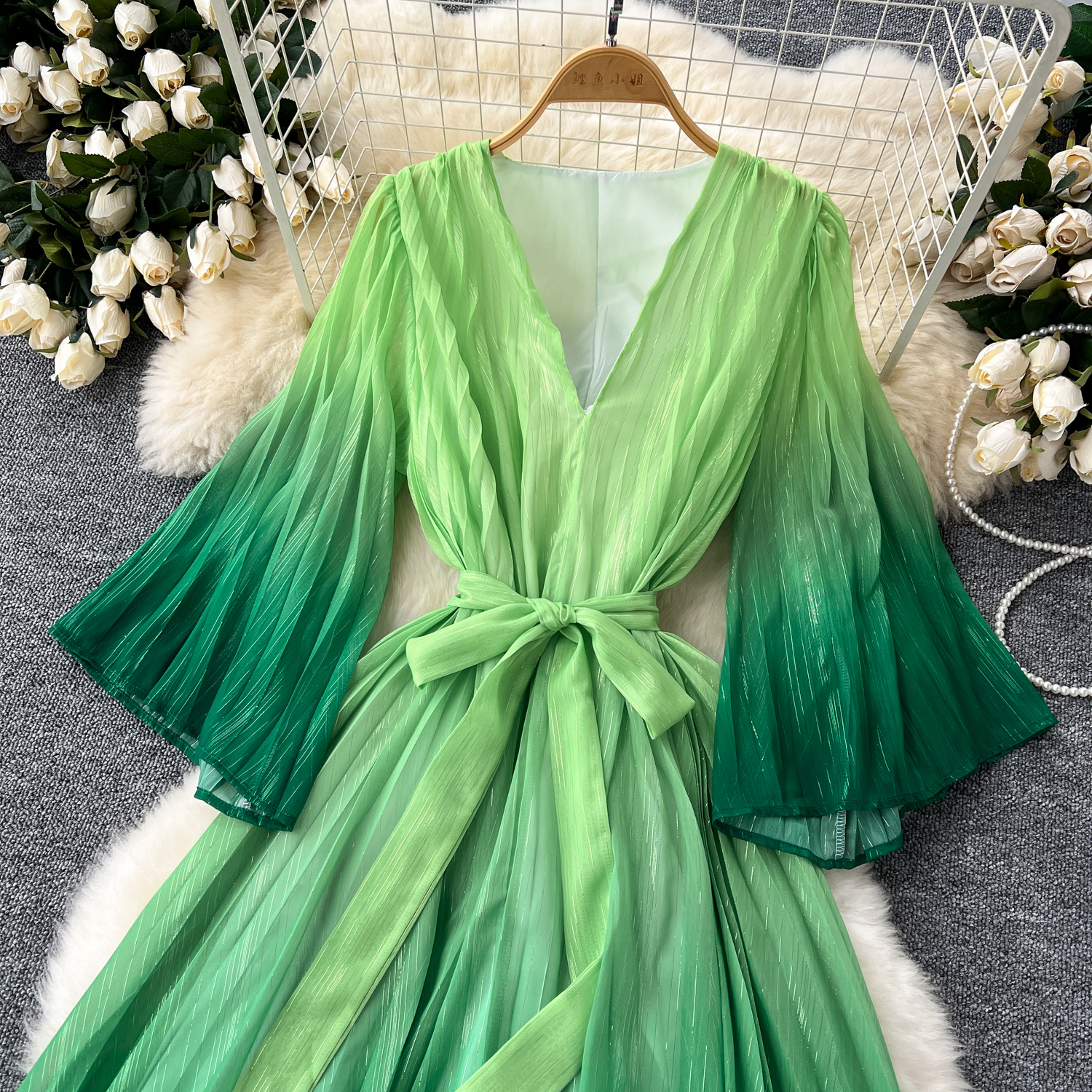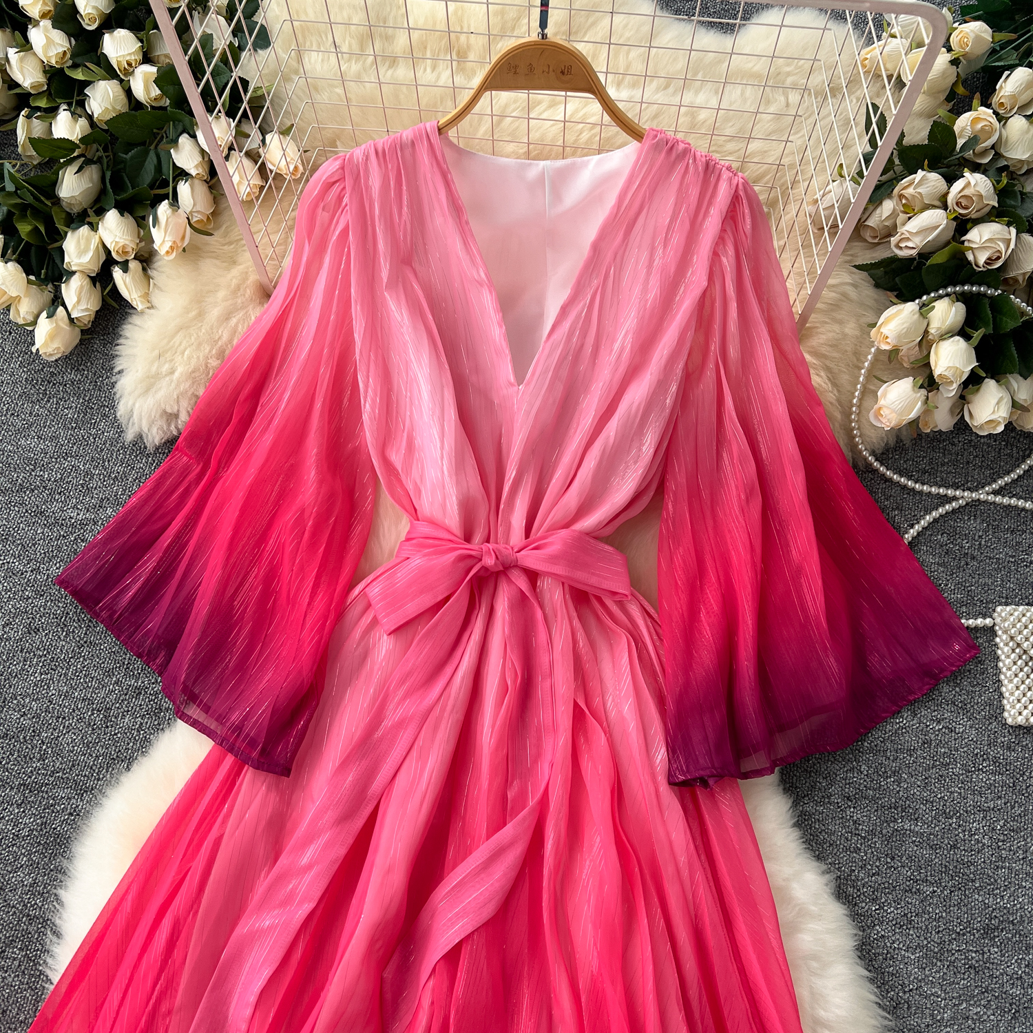 New Loose V-Neck Gradient High-End Waist Tie Bell Sleeve dress For Womens