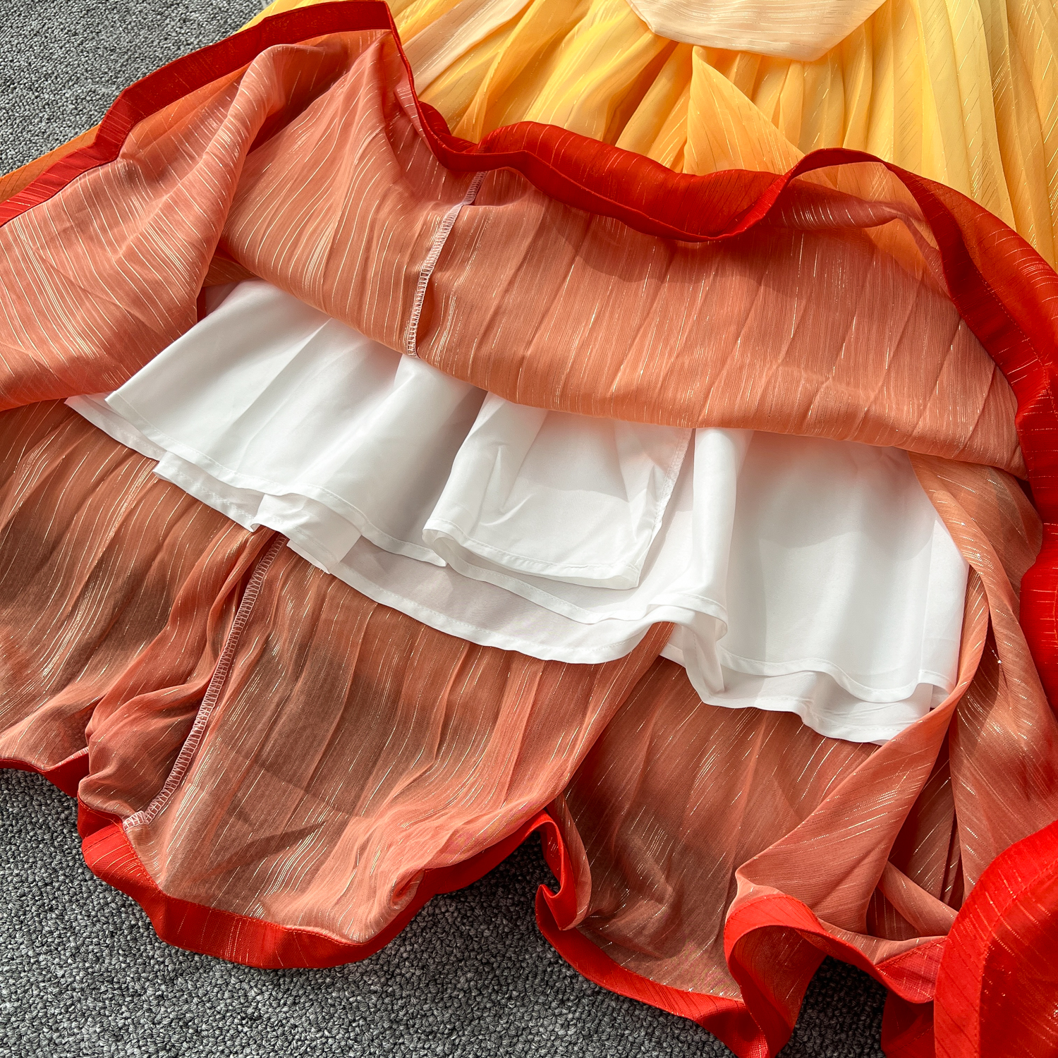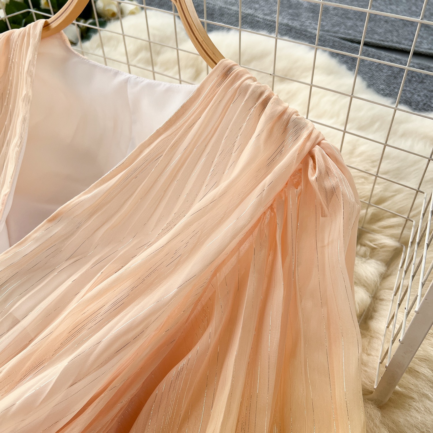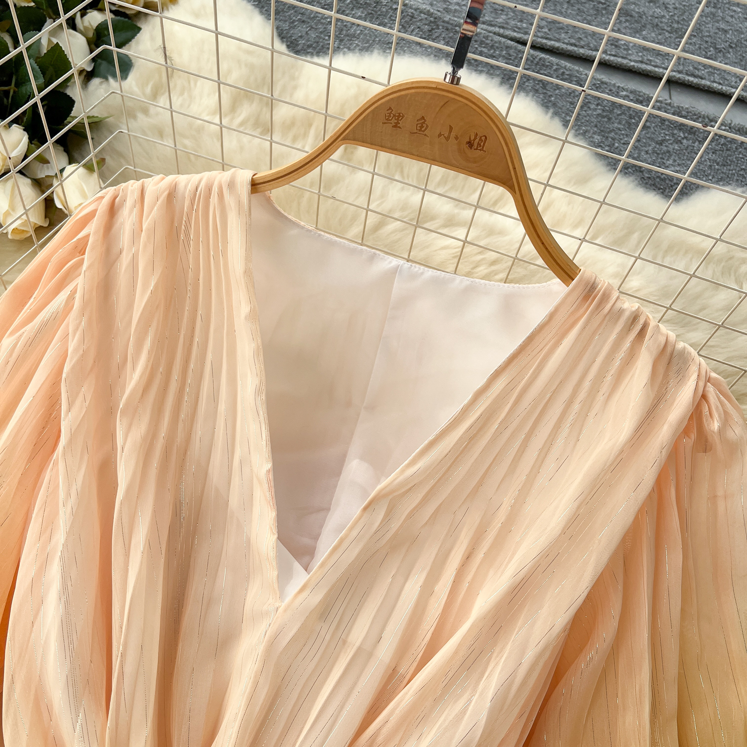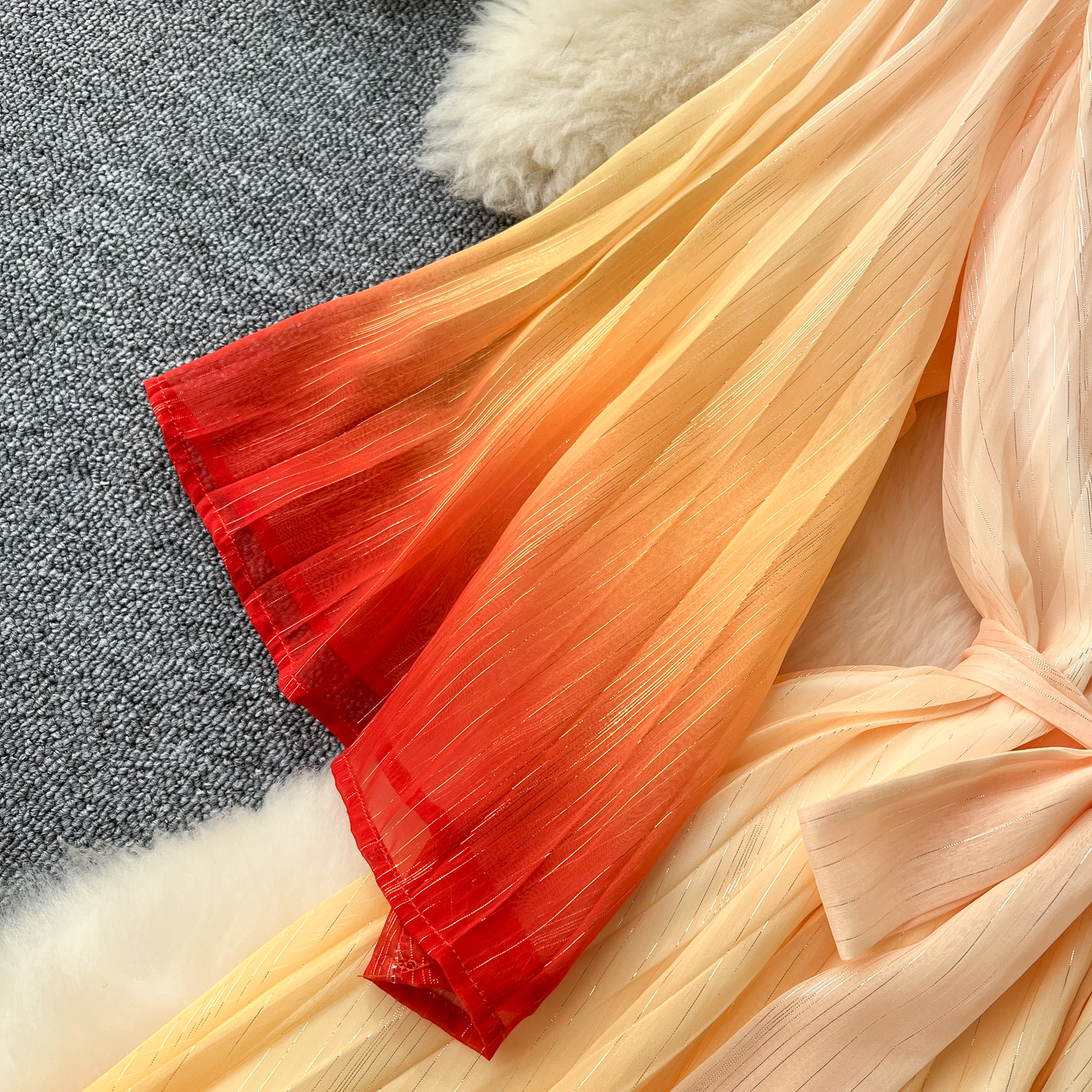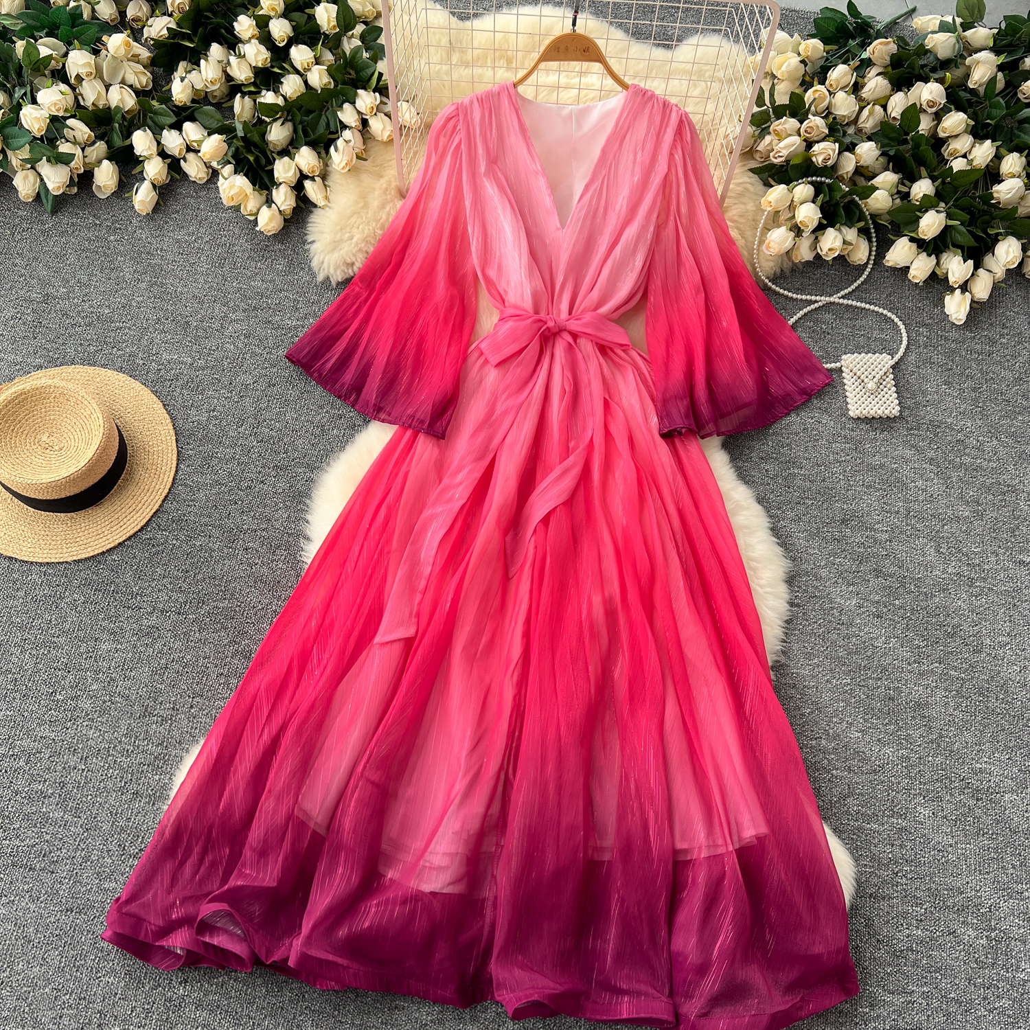 New Loose V-Neck Gradient High-End Waist Tie Bell Sleeve dress For Womens