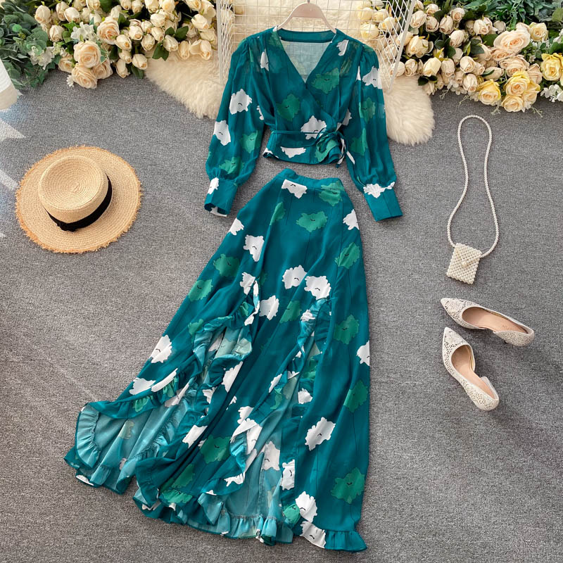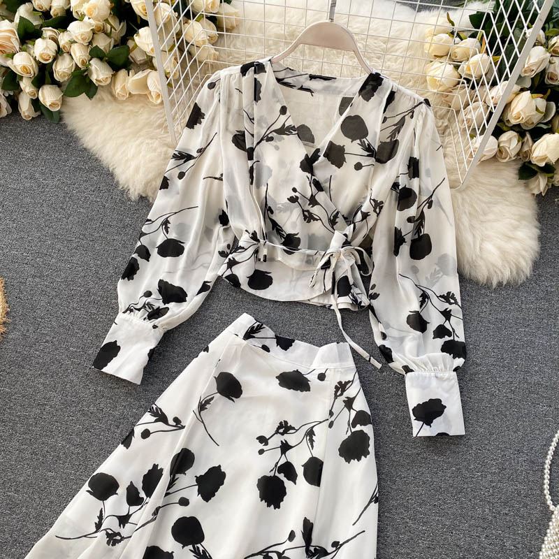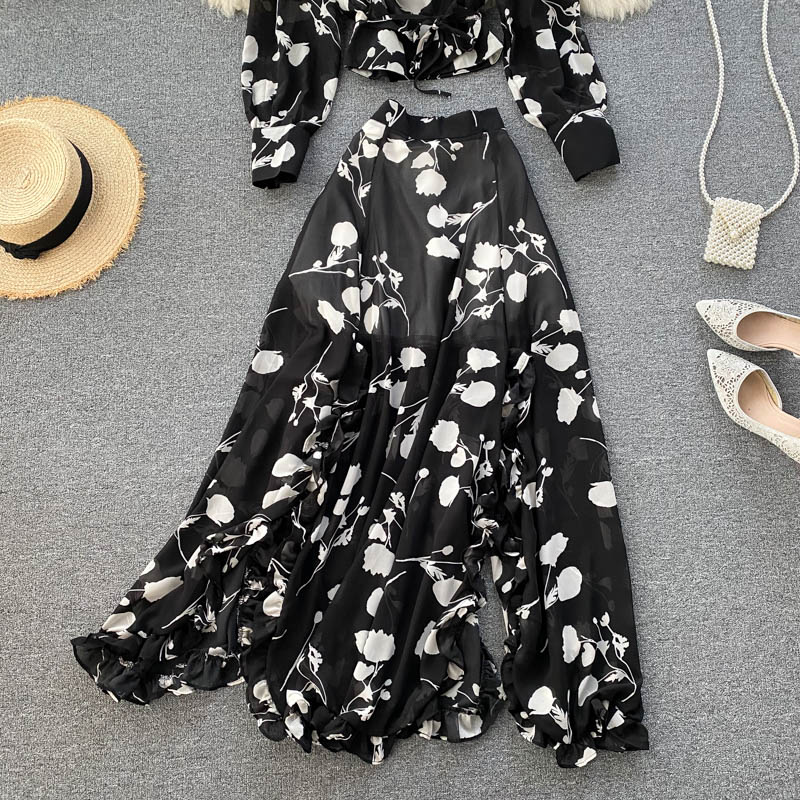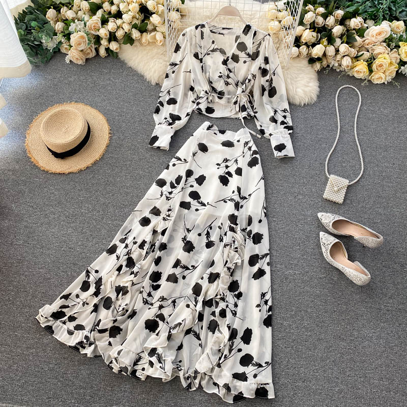 New Seasonal Holiday Style Two-Piece Suit For Women Featuring Chiffon Shirt and Split Skirt