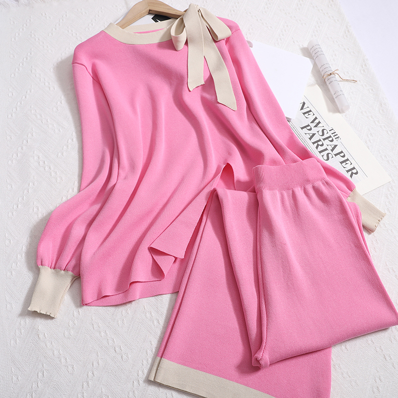 Premium Duo Fall Fashion Round Neck Lace Long Sleeve Slit Top High Waist Casual Pants