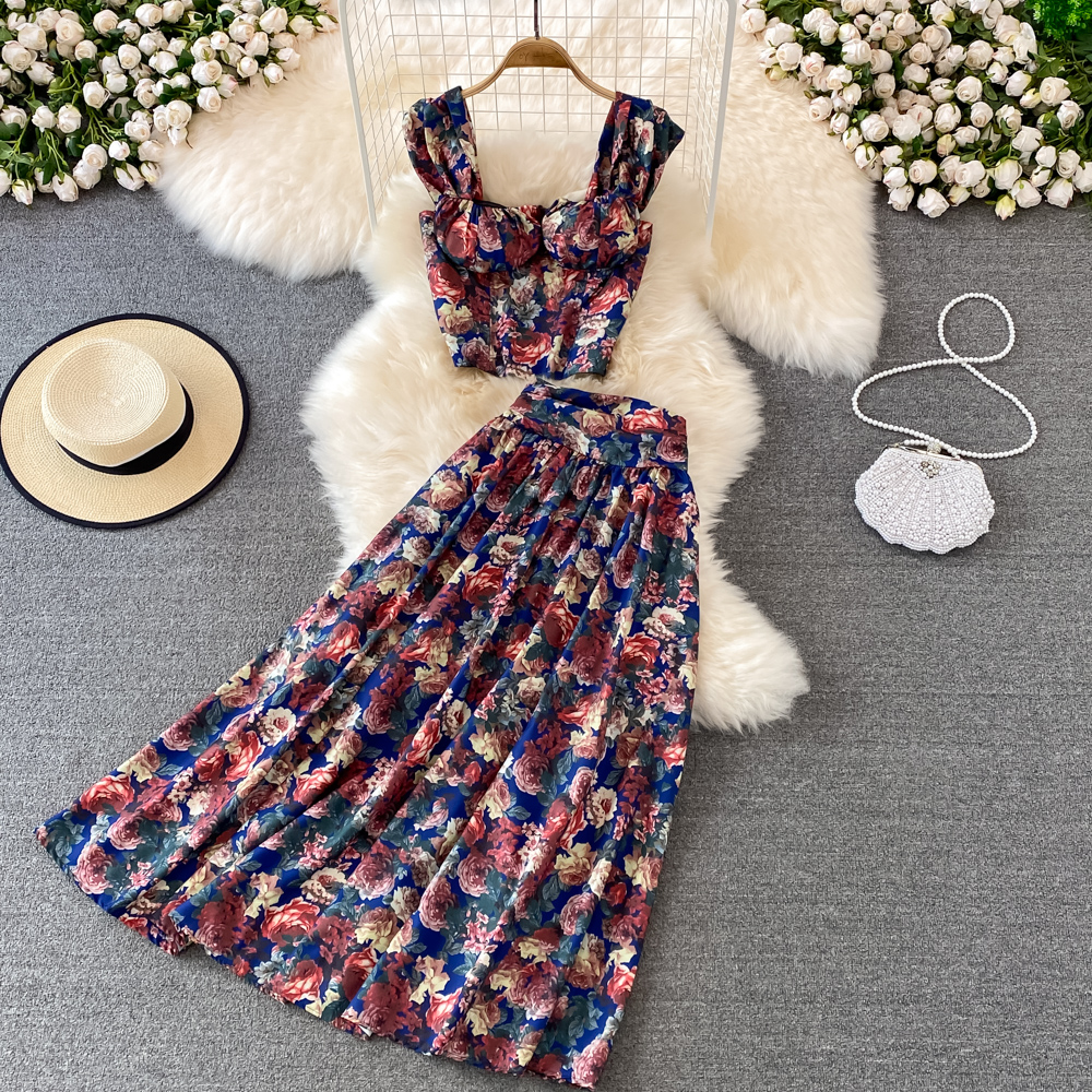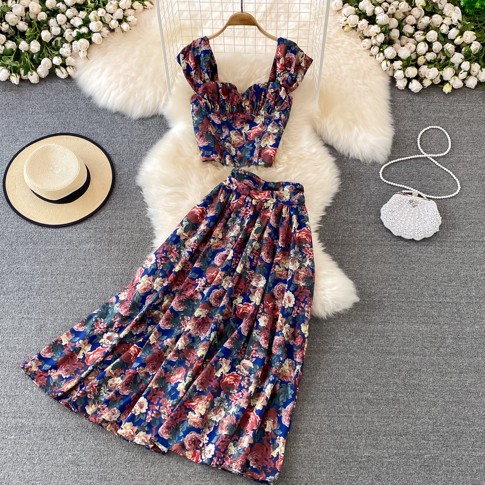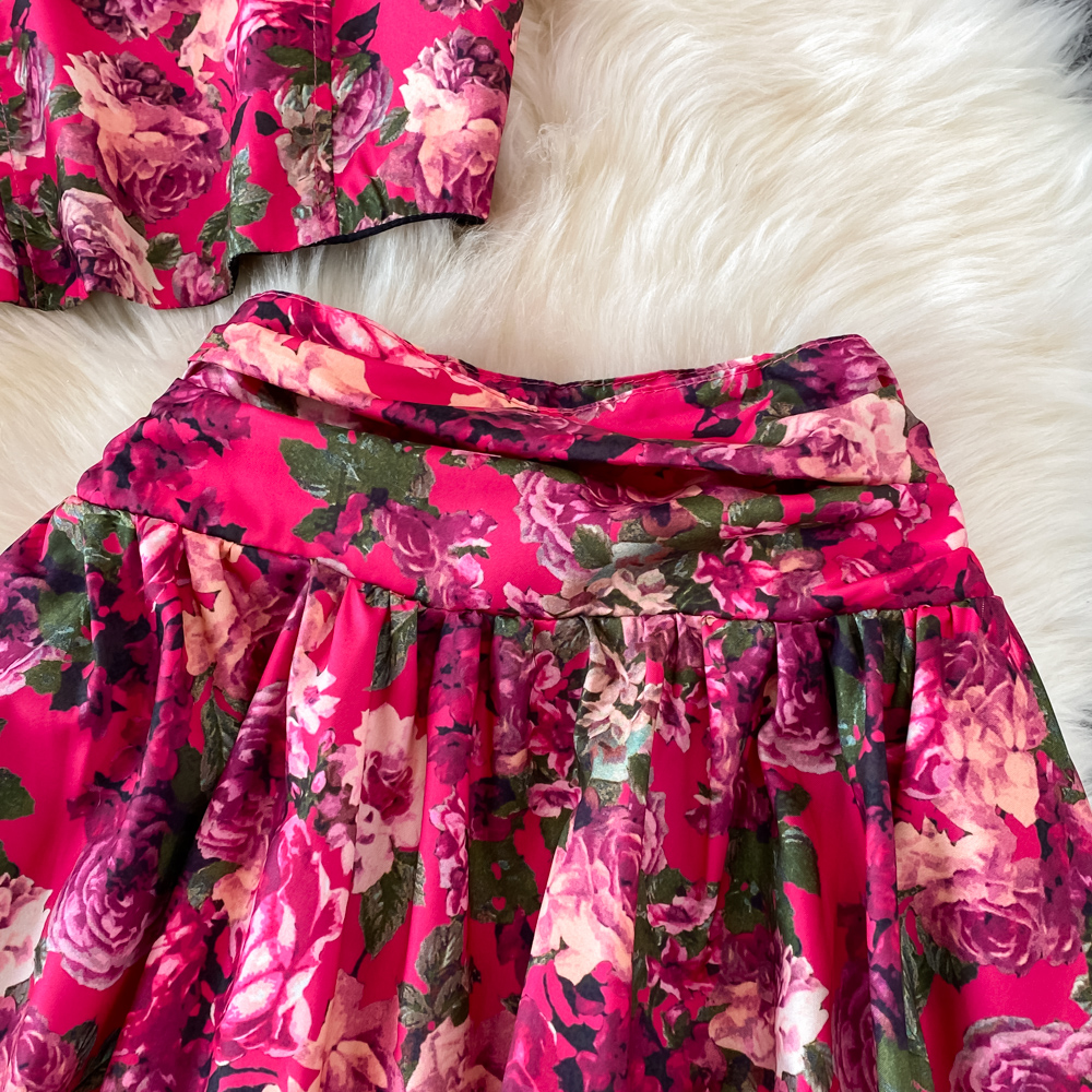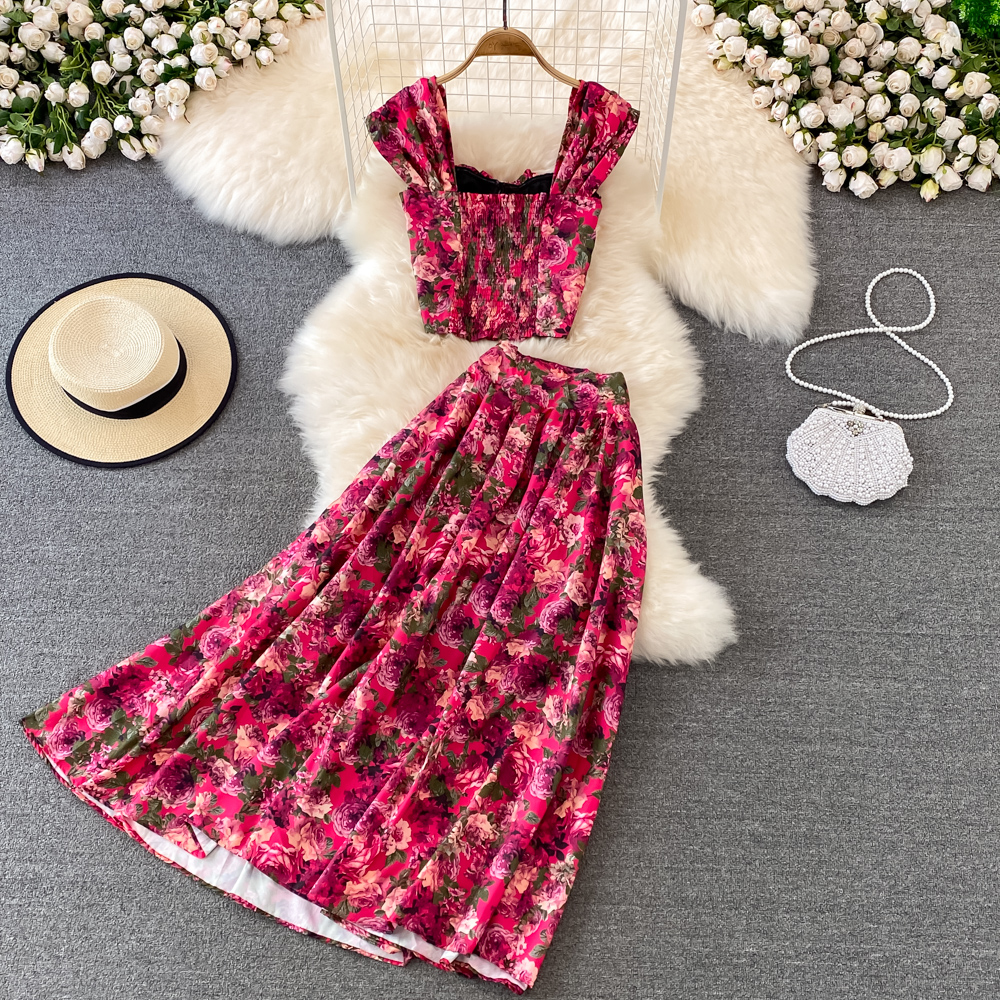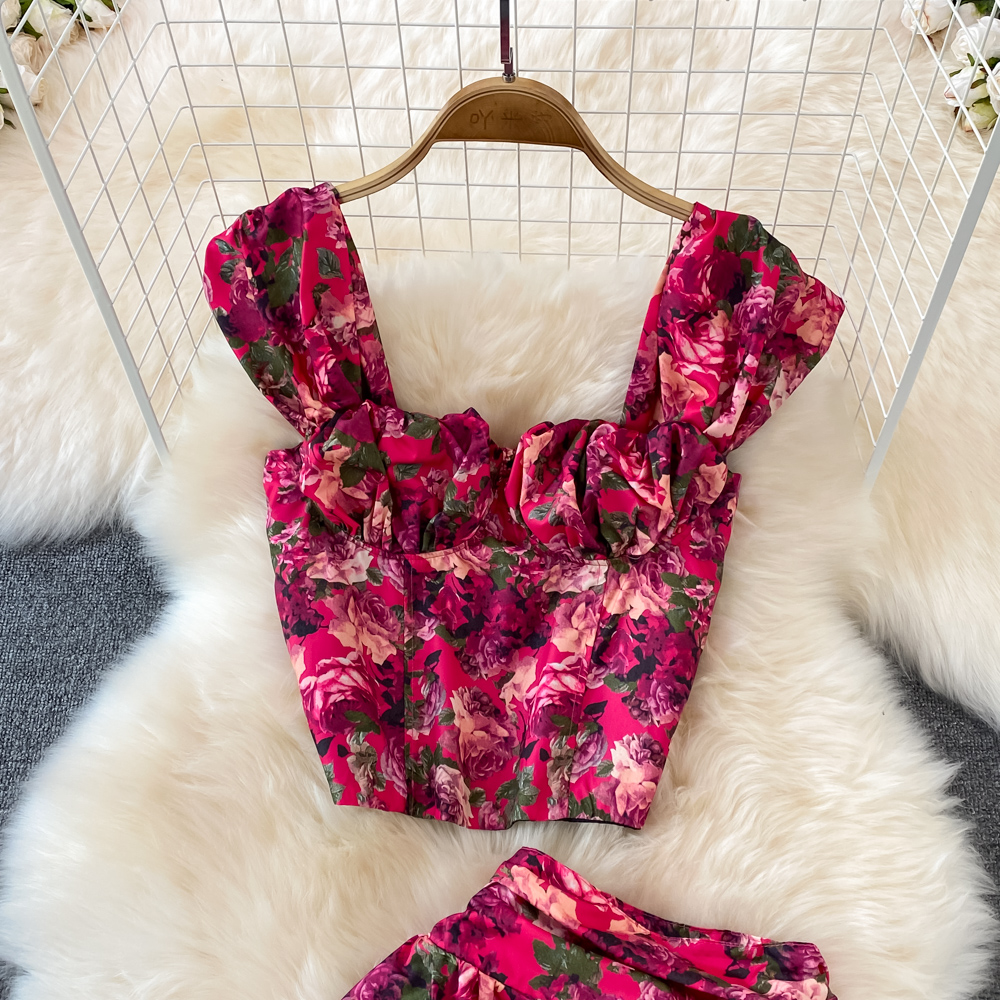 Seaside Elegant High-Waisted A-Line Floral Skirt and Cropped Top
