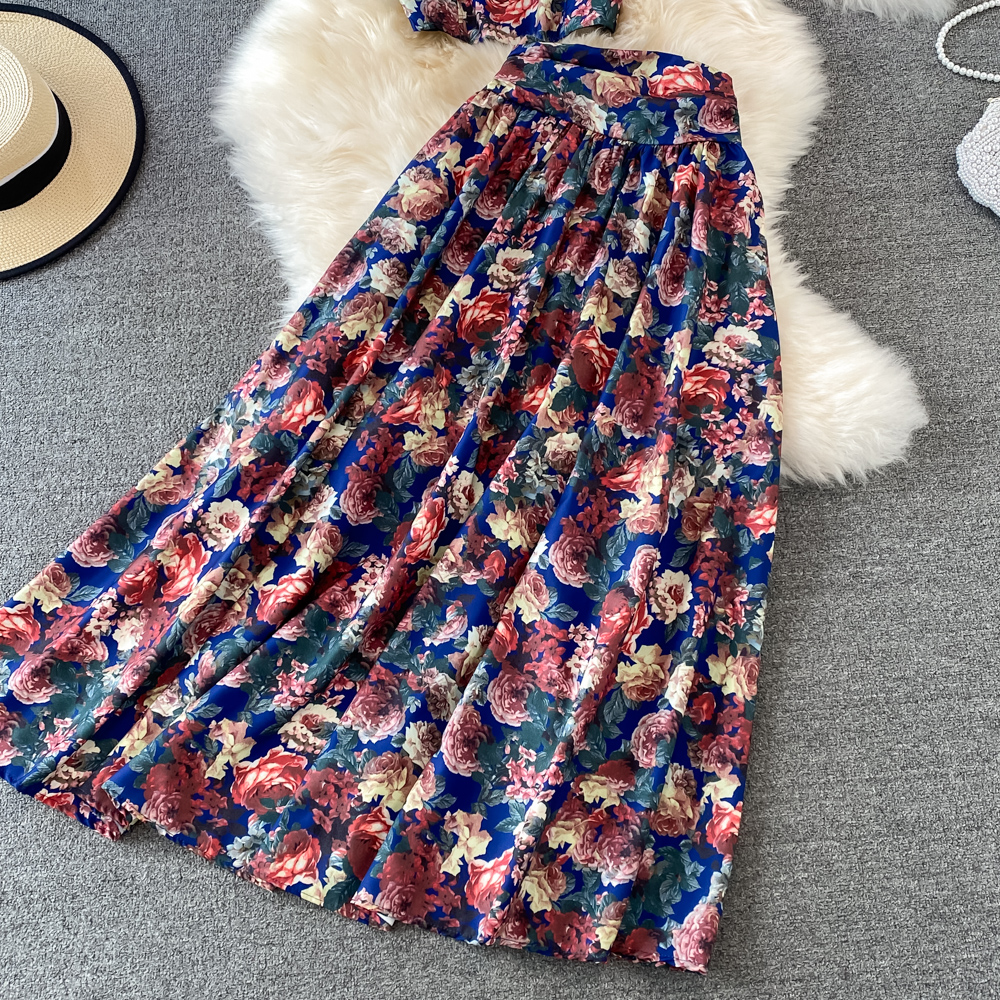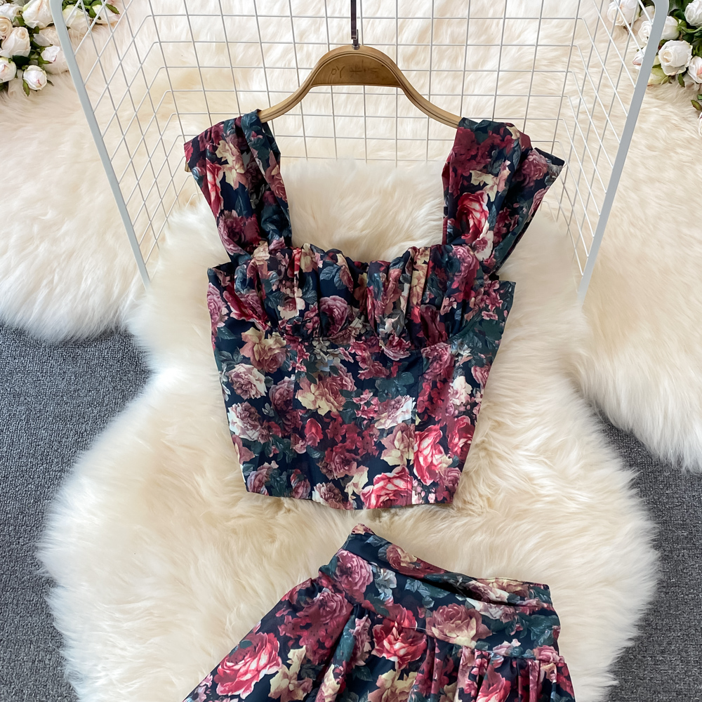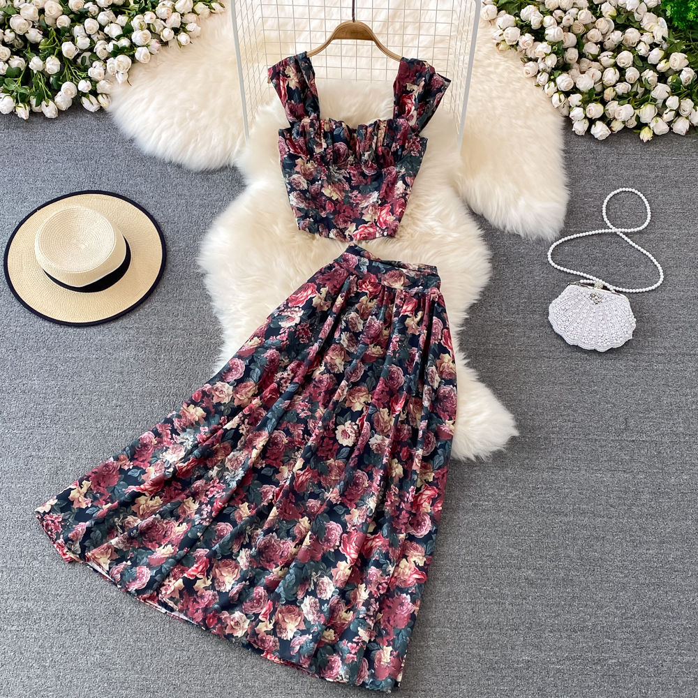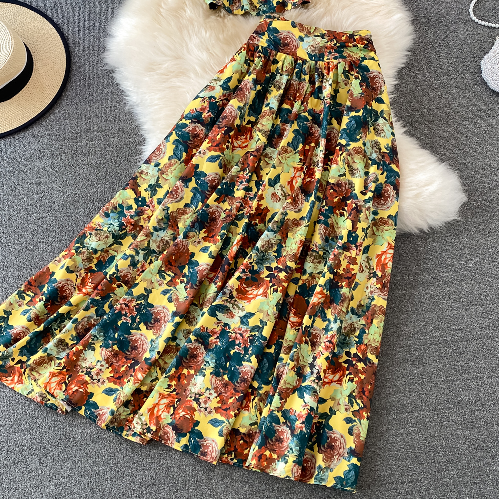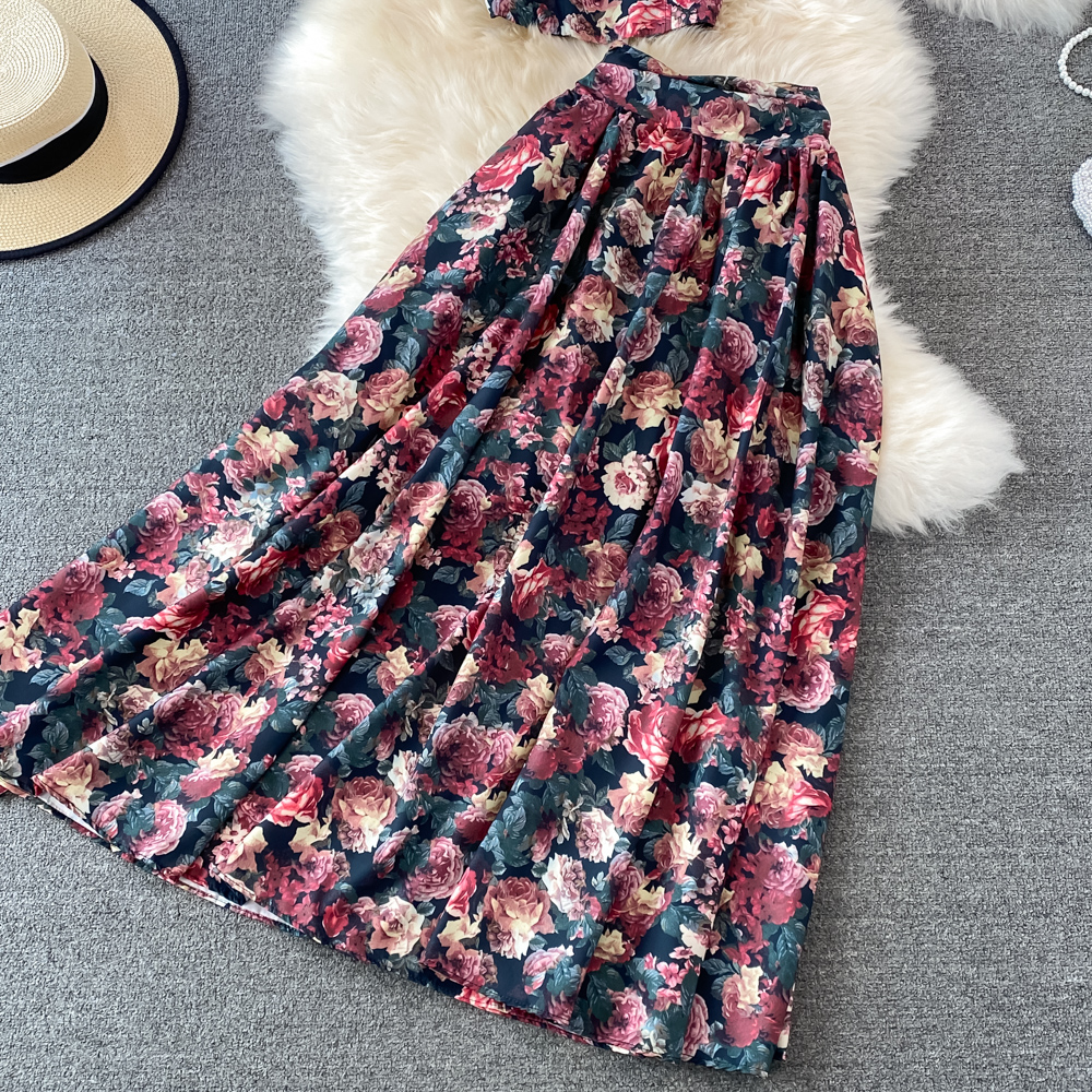 Seaside Elegant High-Waisted A-Line Floral Skirt and Cropped Top