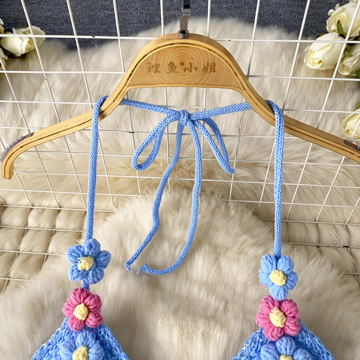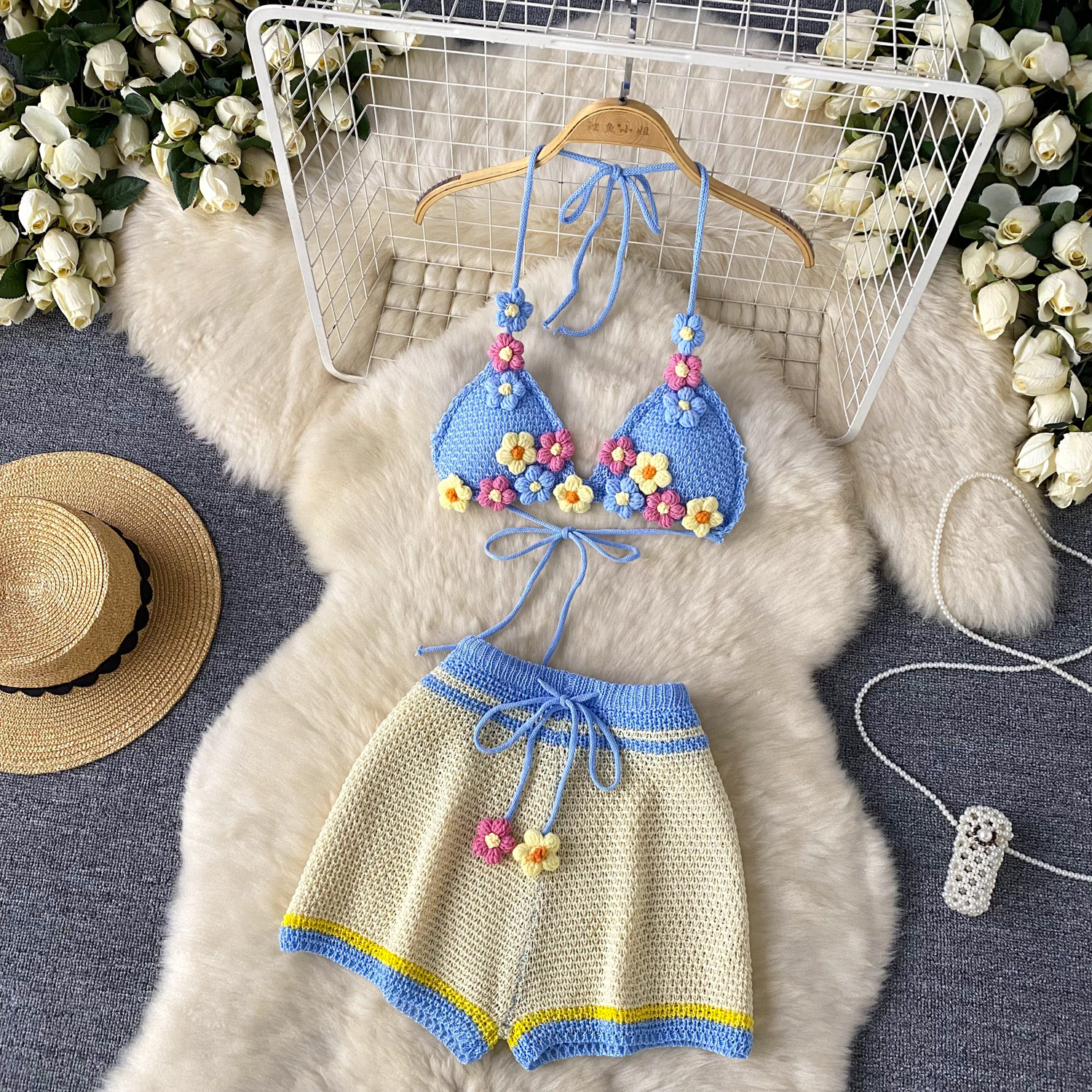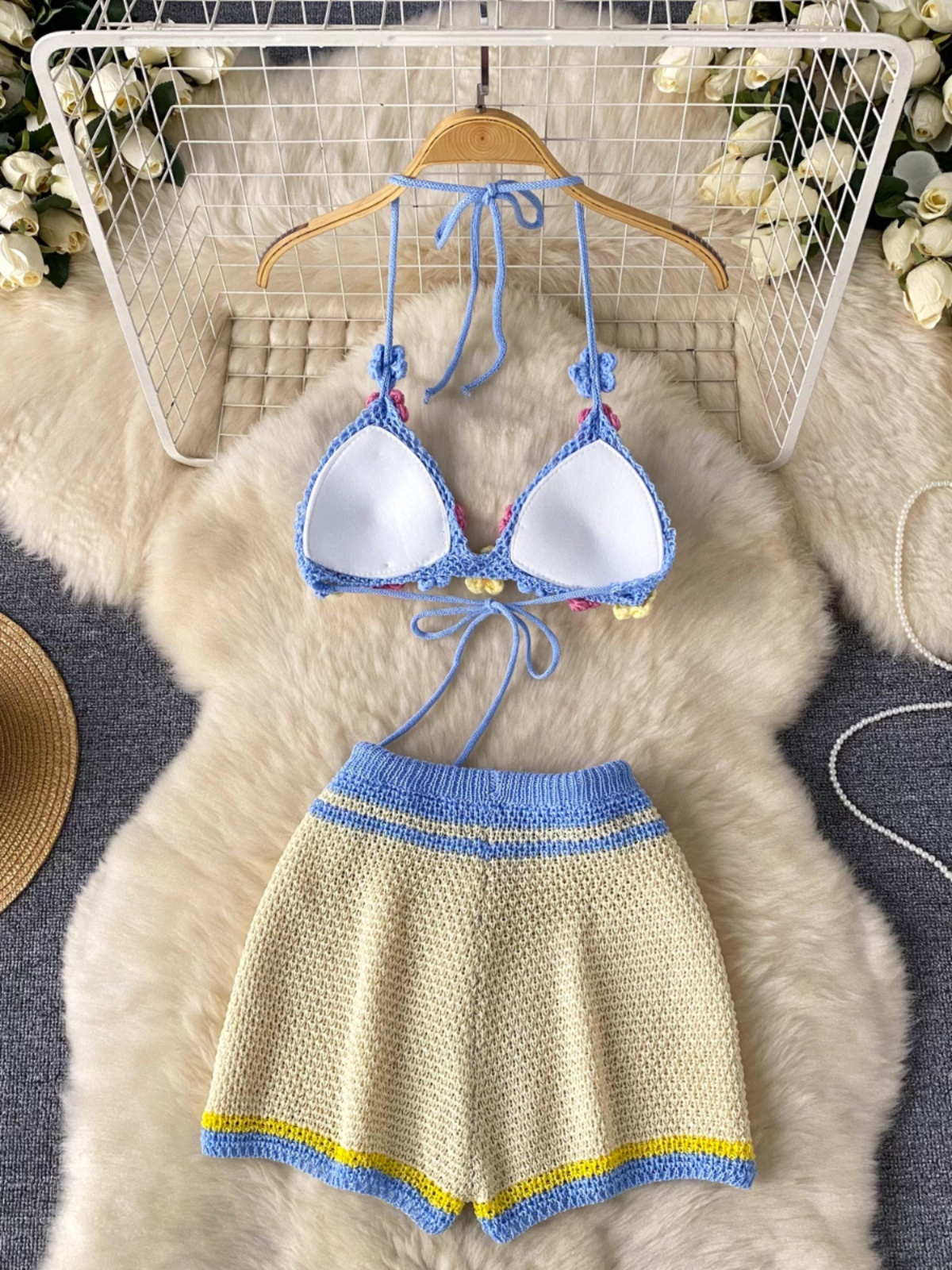 Seaside Style Pure Desire knitted Summer Suspender Bandeau Top & High-Waisted Wide-Leg Shorts Suit