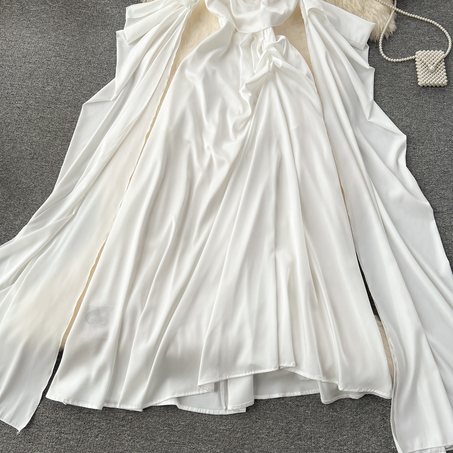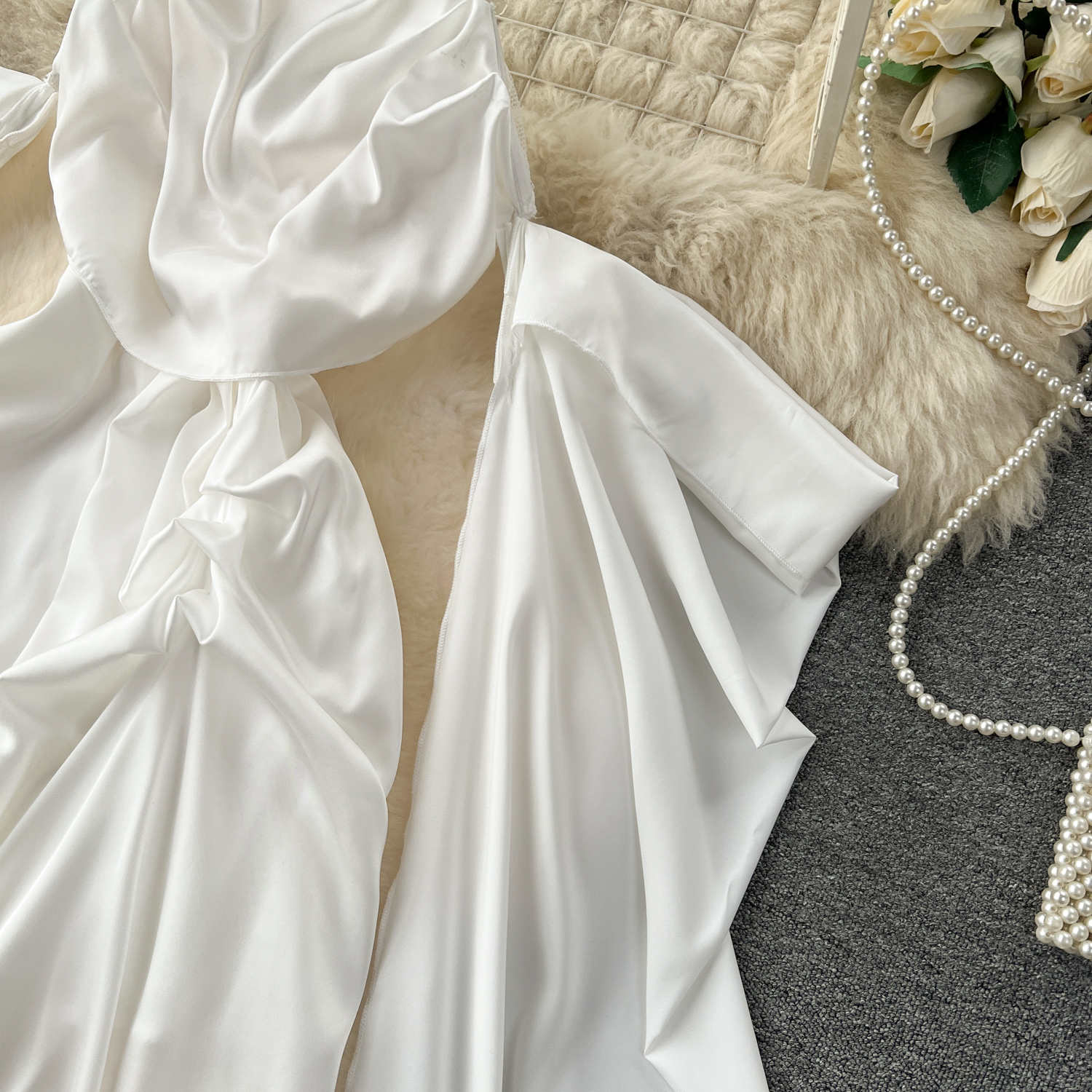 Sophisticated High-End Satin Dress with Pleated Water Sleeves and Cinched Waist