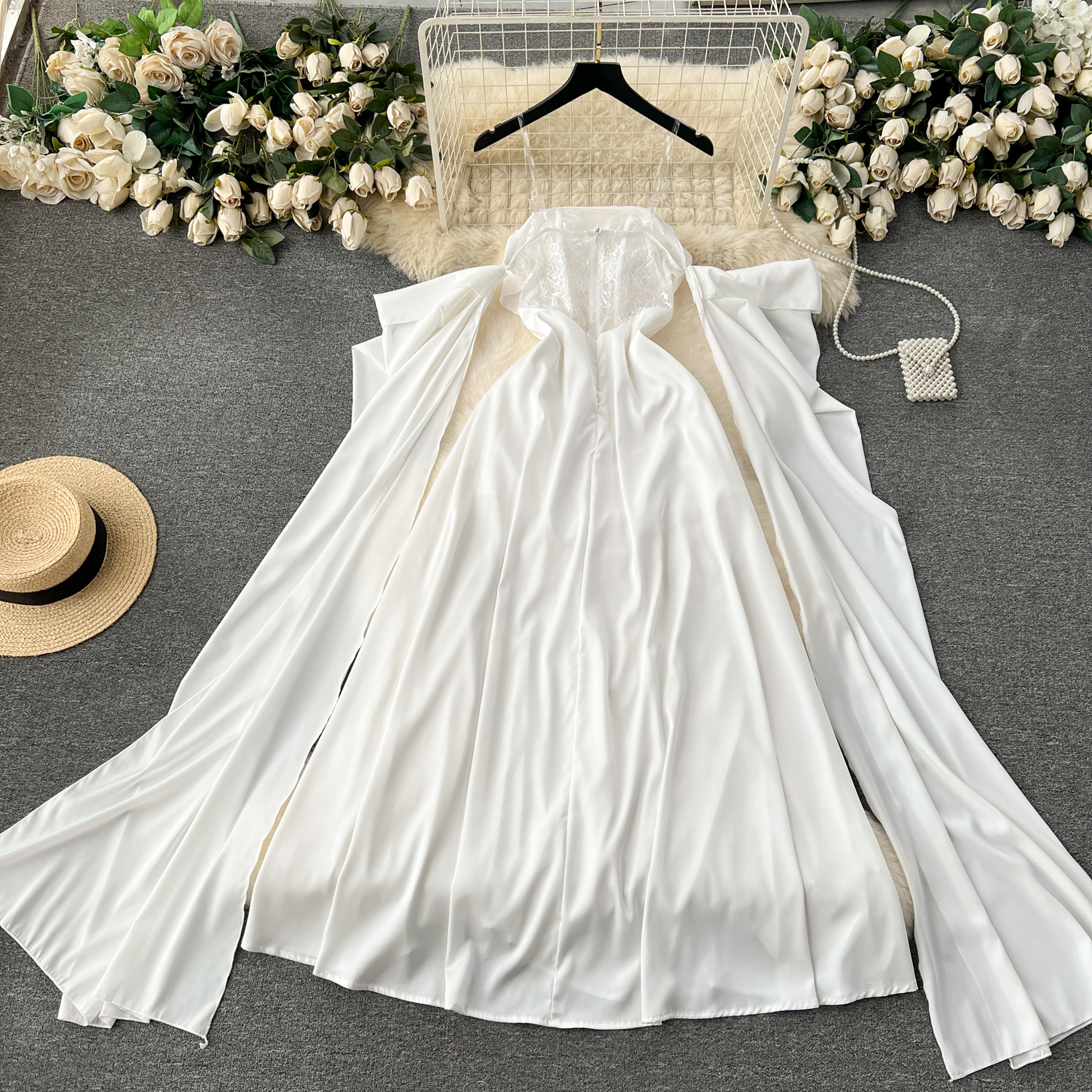 - Pattern: Square neckline dress with a gown-inspired silhouette
