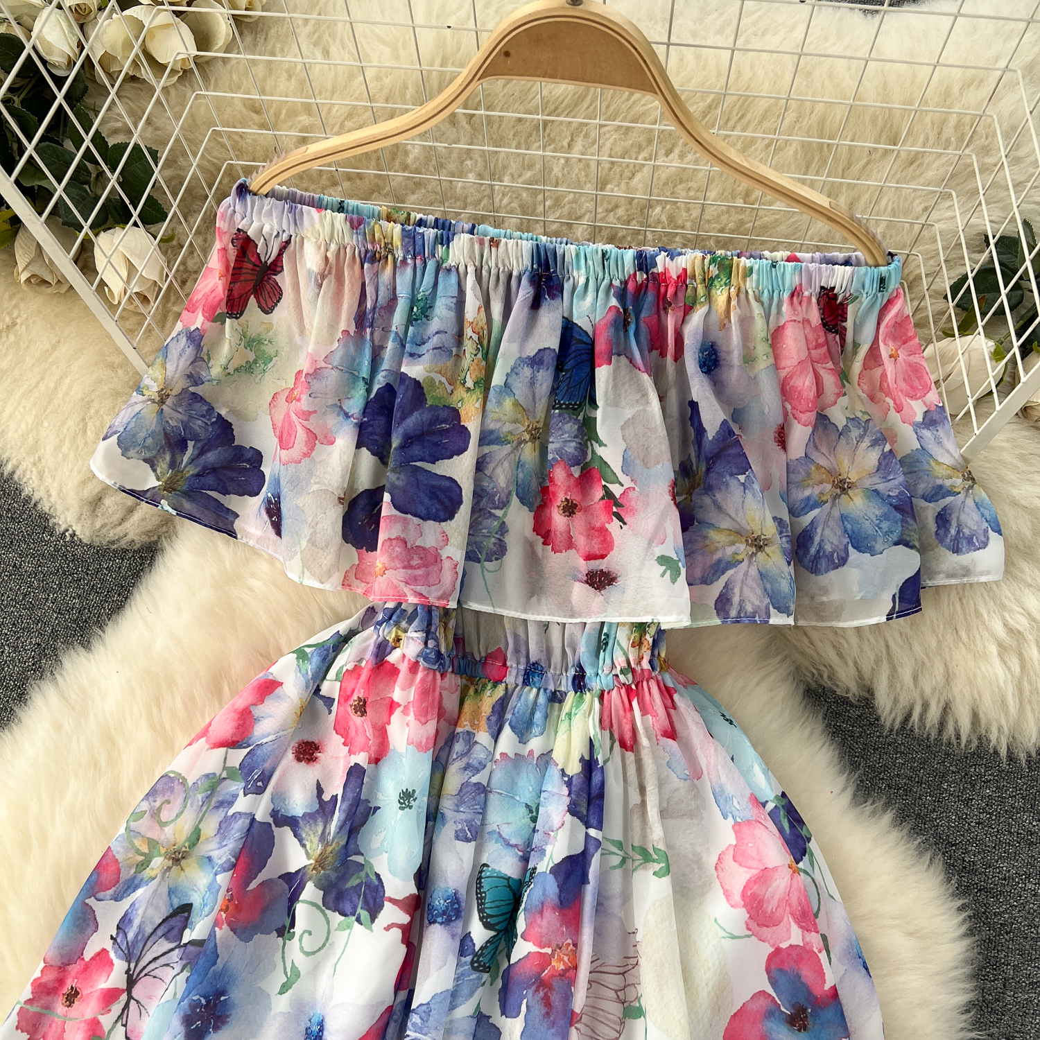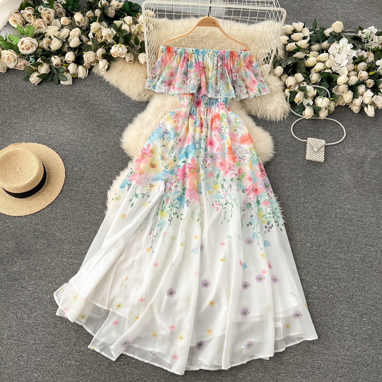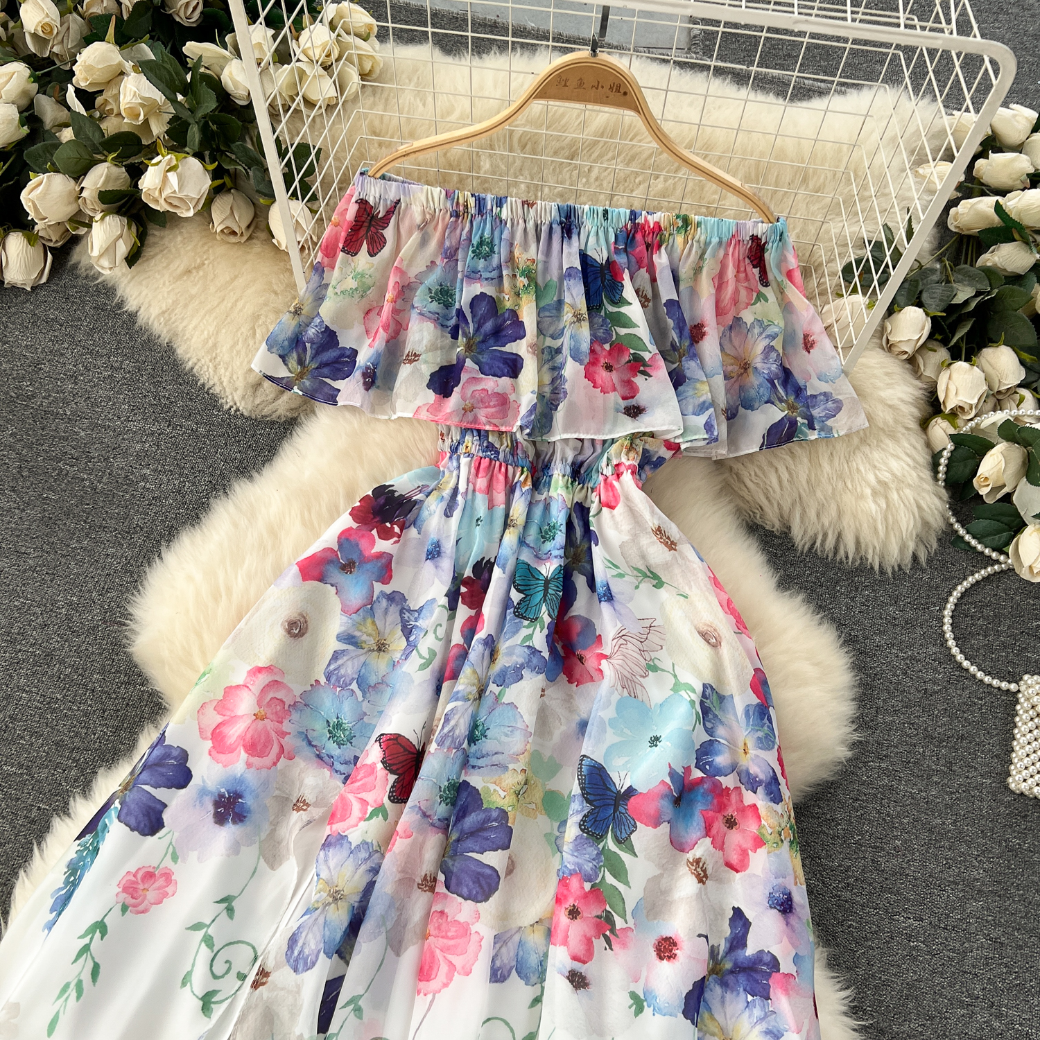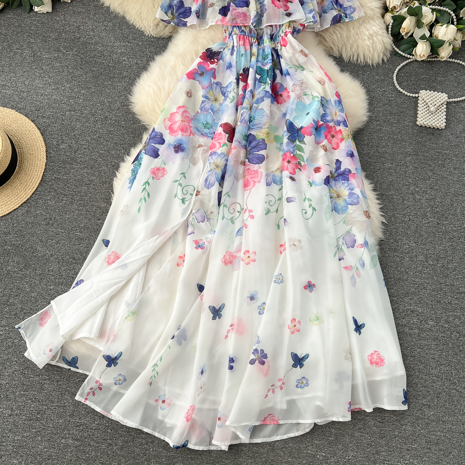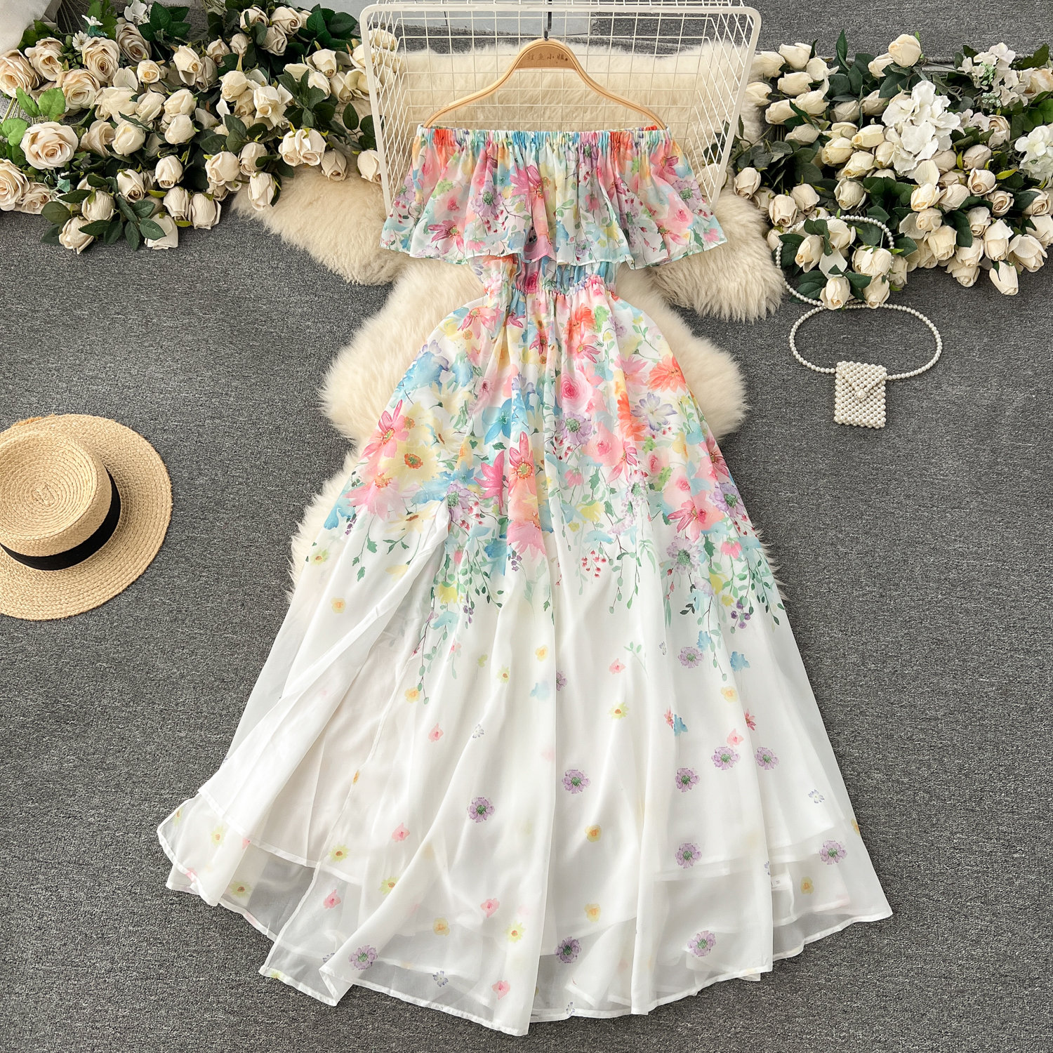 Sophisticated One Shoulder Slim Long Chiffon Fairy Dress with Beautiful Floral Patterns