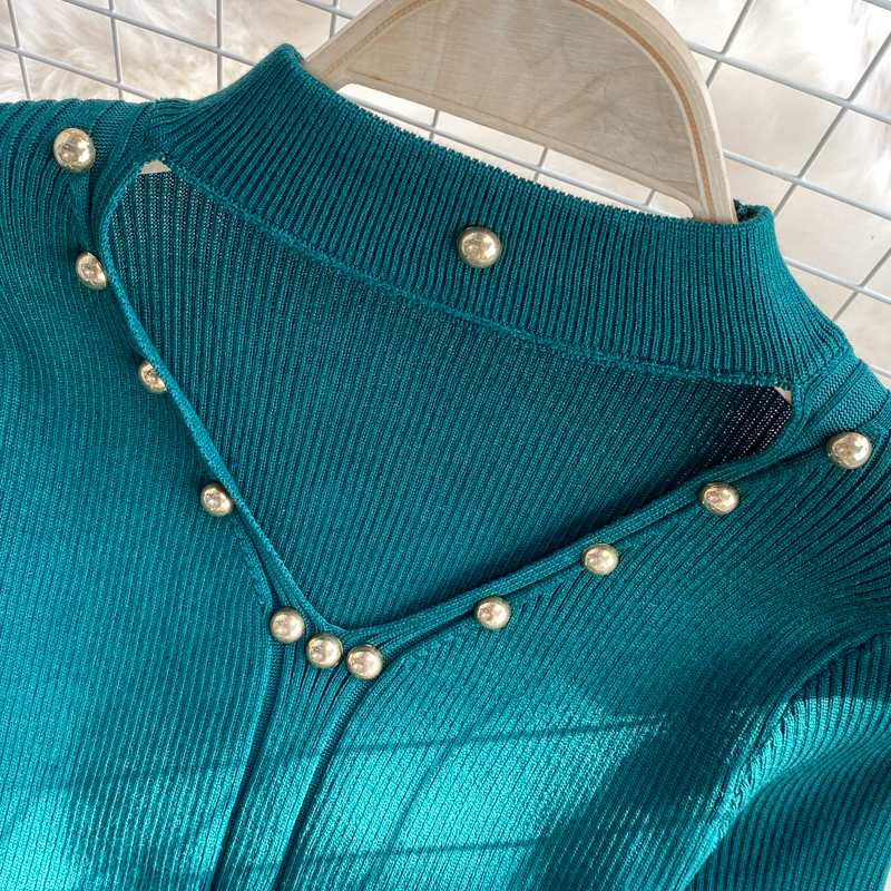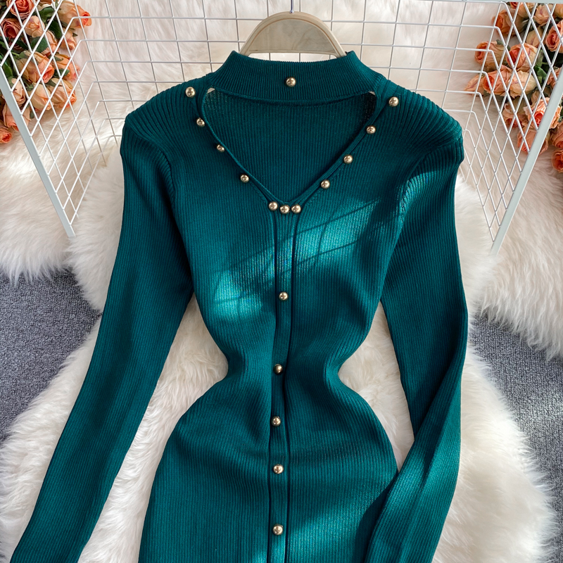 Sophisticated Winter Stretch Knitted Bodycon With Halterneck, V-Neck, and Long Sleeves