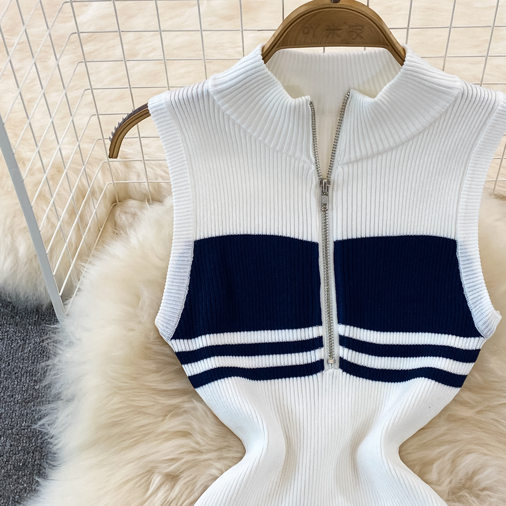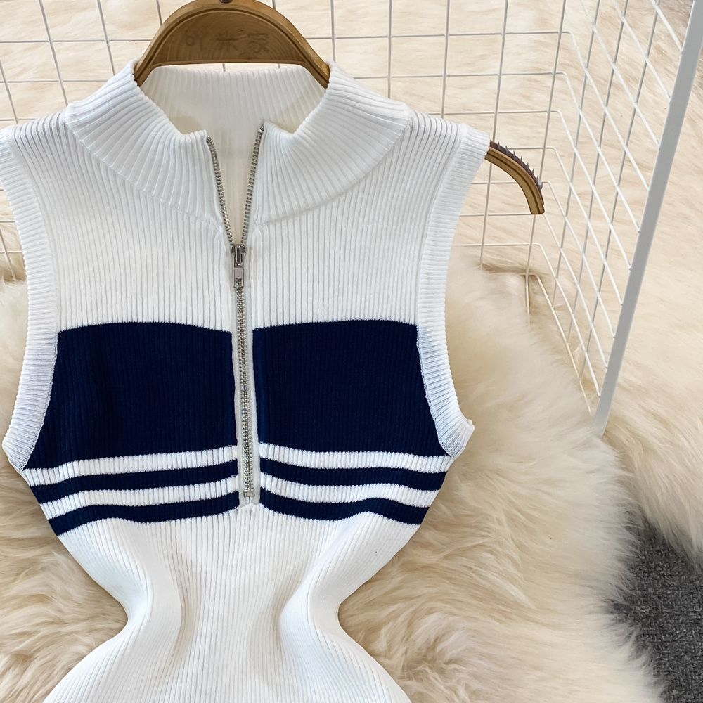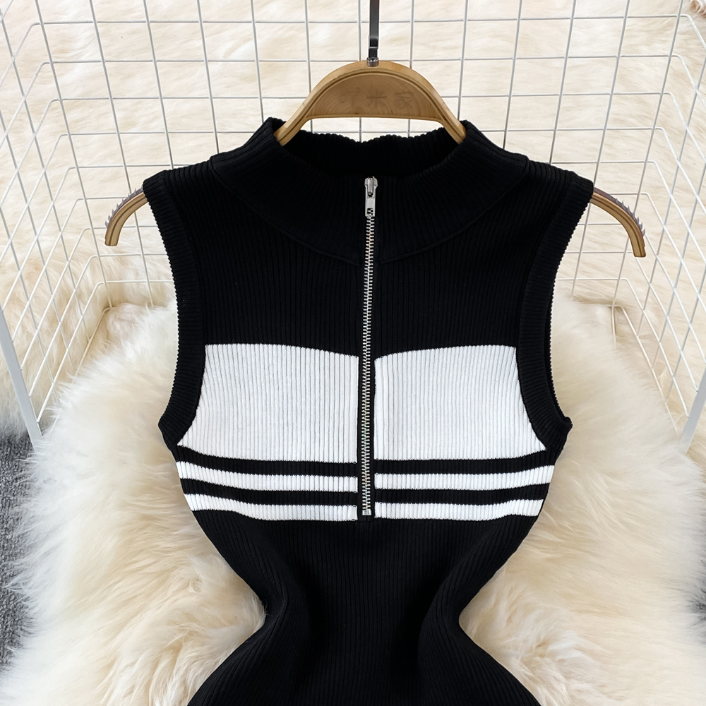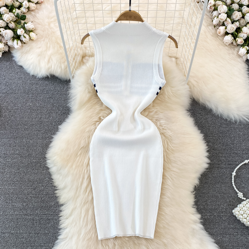 Summer High-End Polo Collar Striped knitted Vest Slim Hip Bodycon Dress