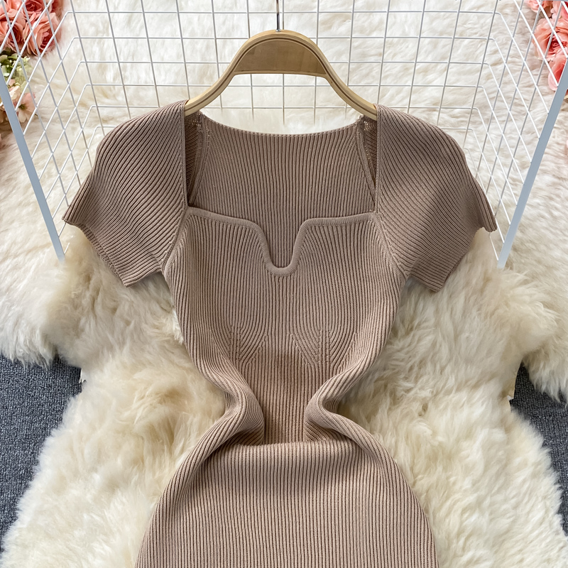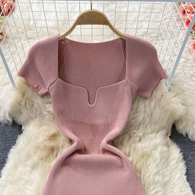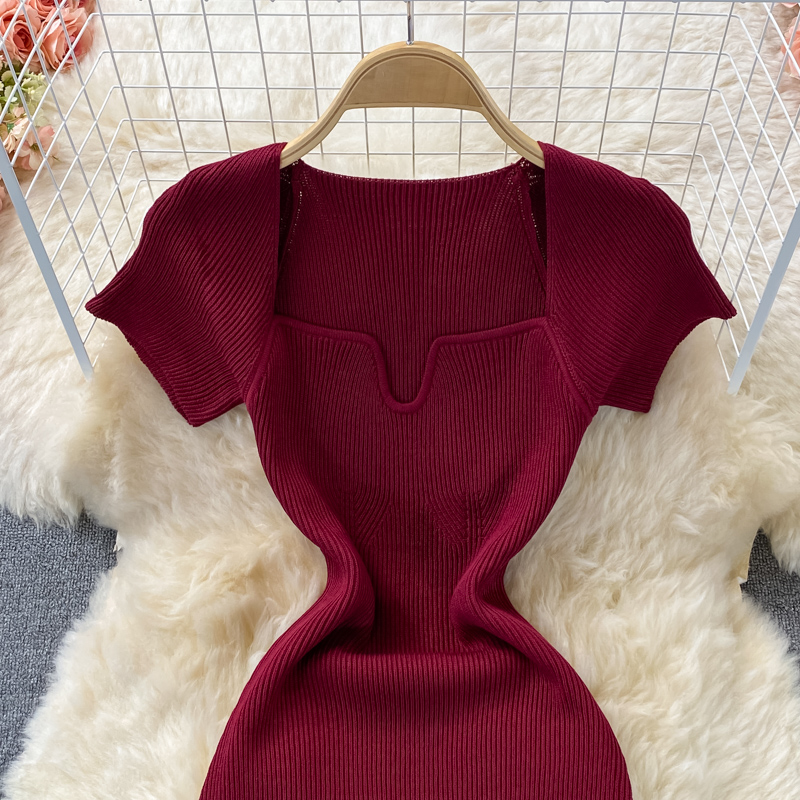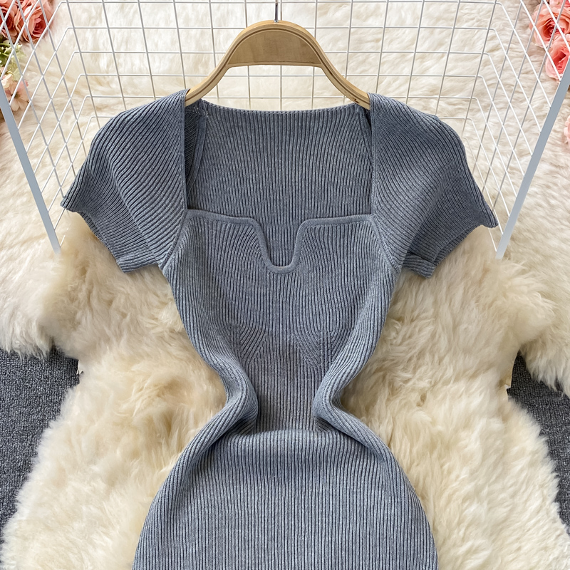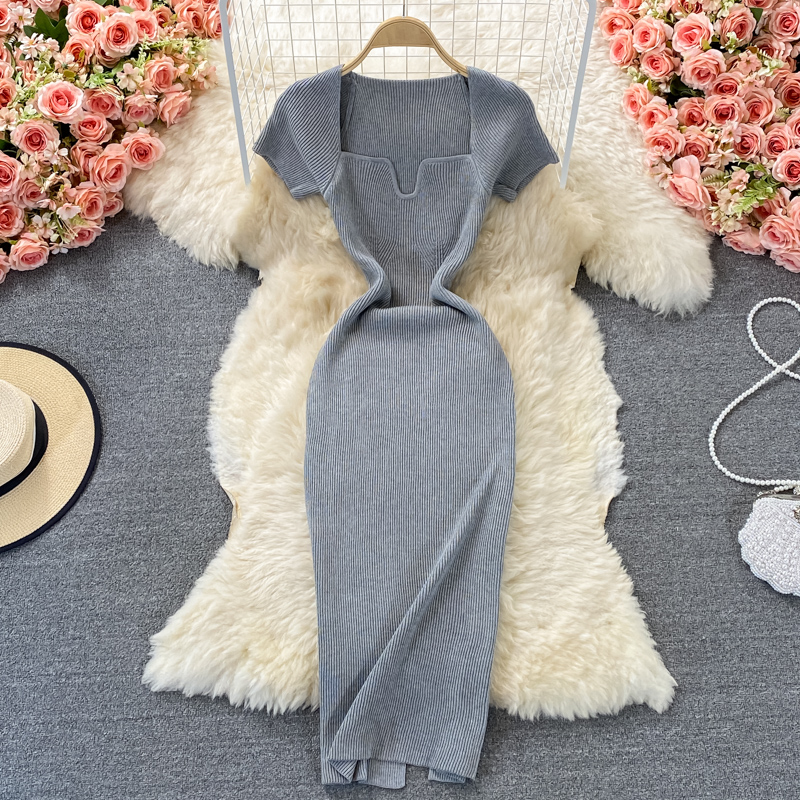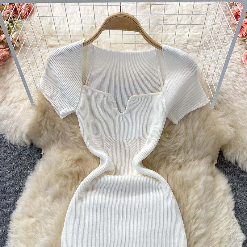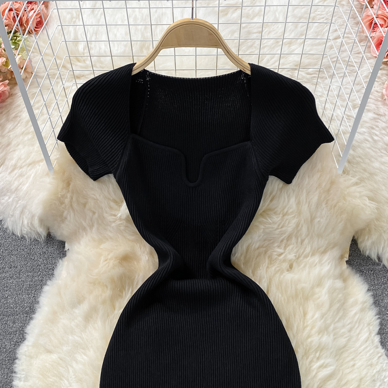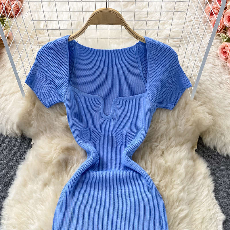 Tight and thin, square neck knit dress, short sleeves, summer 2024, new temperament, sexy hot girl, hip wrap long skirt