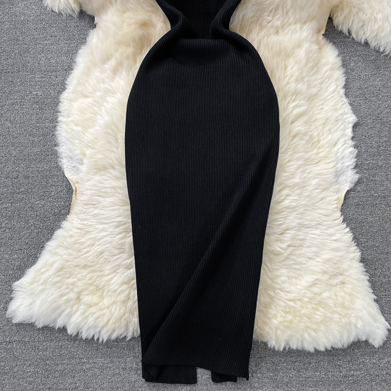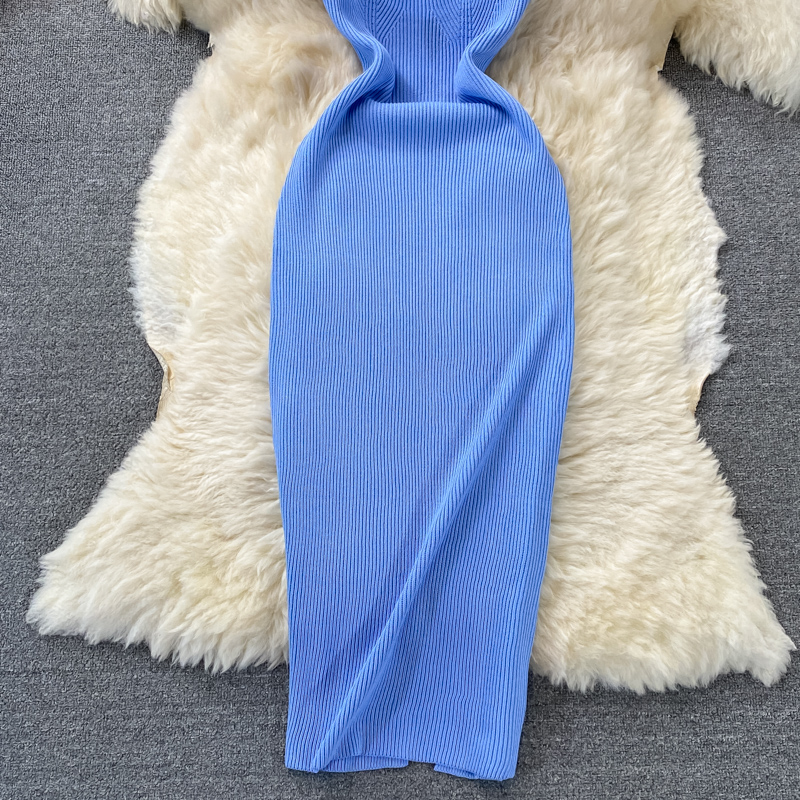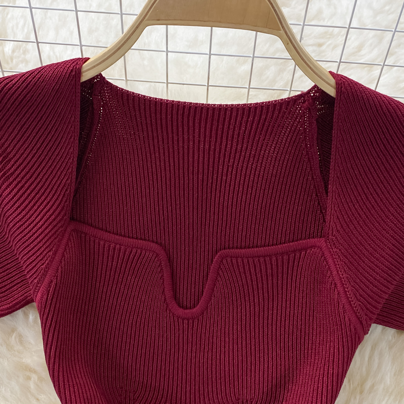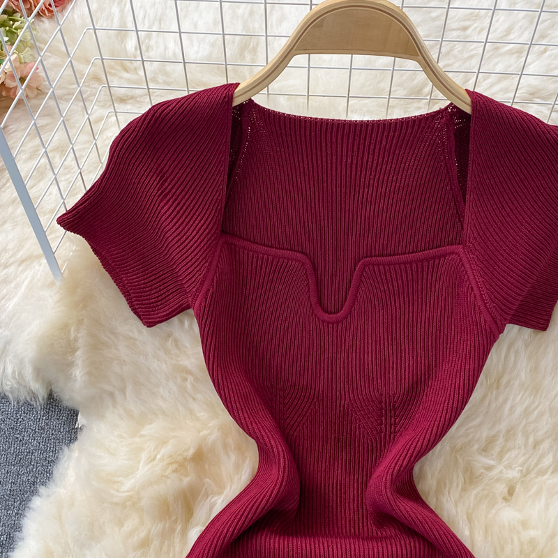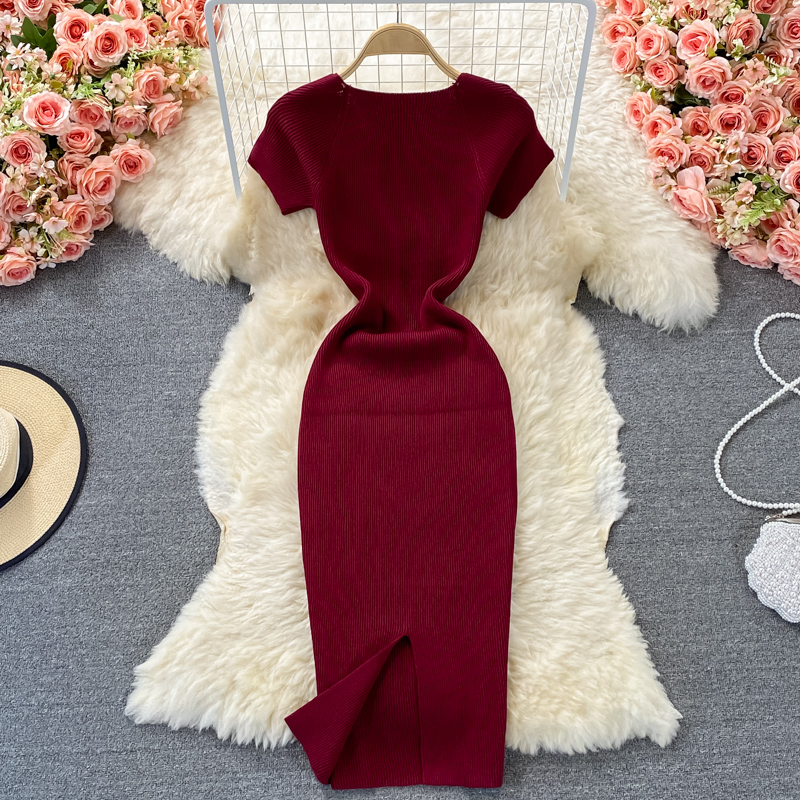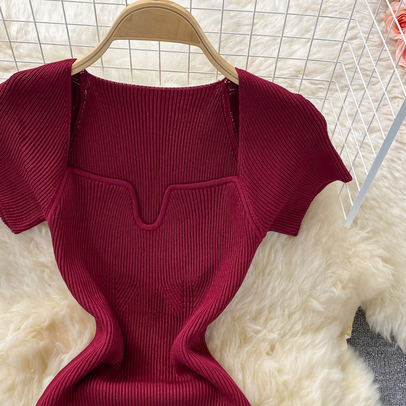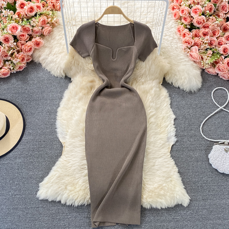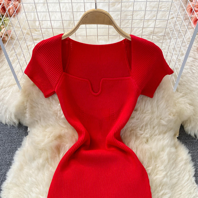 Tight and thin, square neck knit dress, short sleeves, summer 2024, new temperament, sexy hot girl, hip wrap long skirt