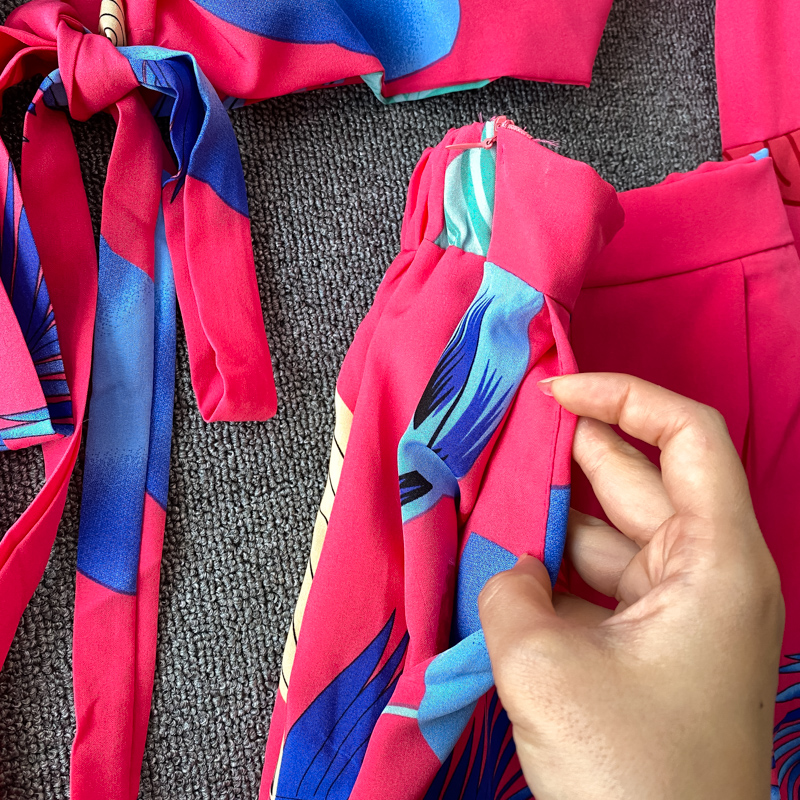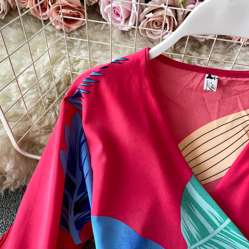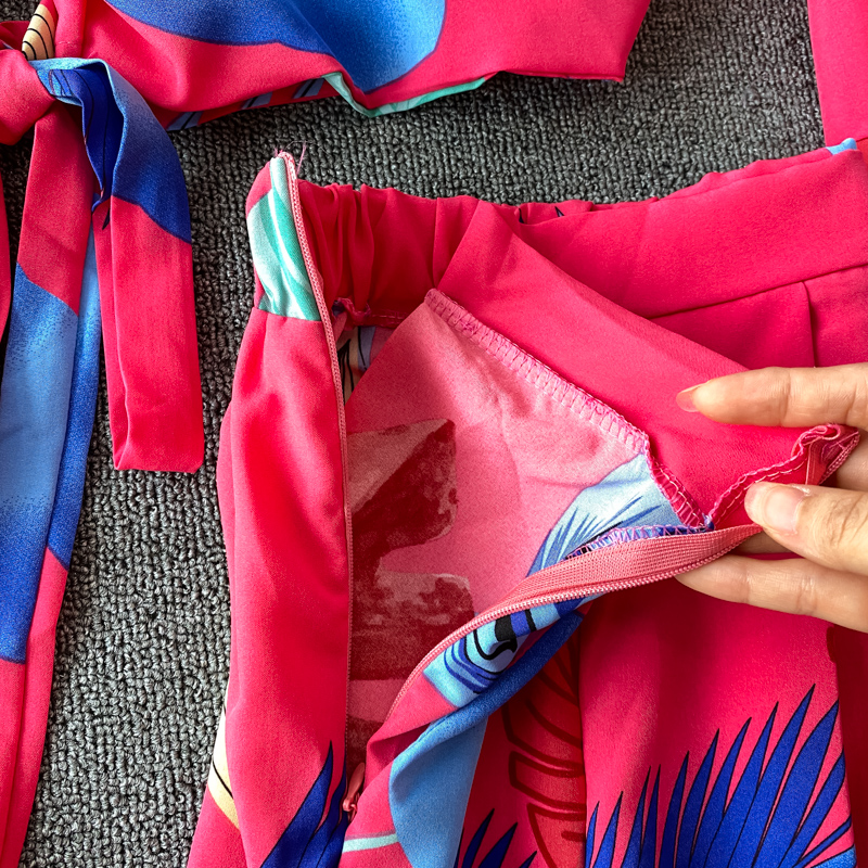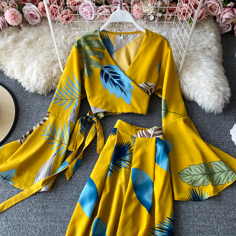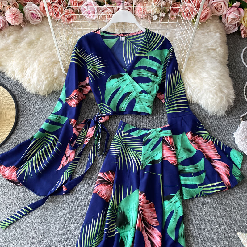 V-neck Floral Design printed tops flared sleeves high waist two-piece suits