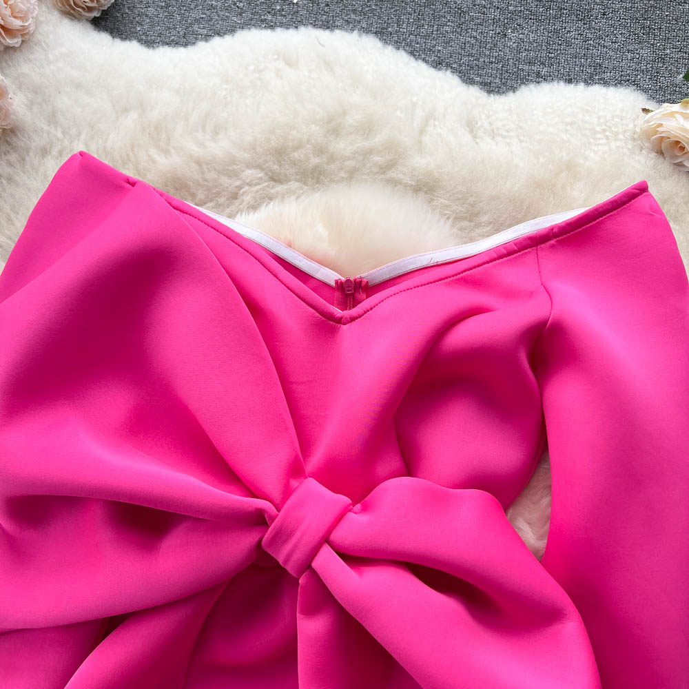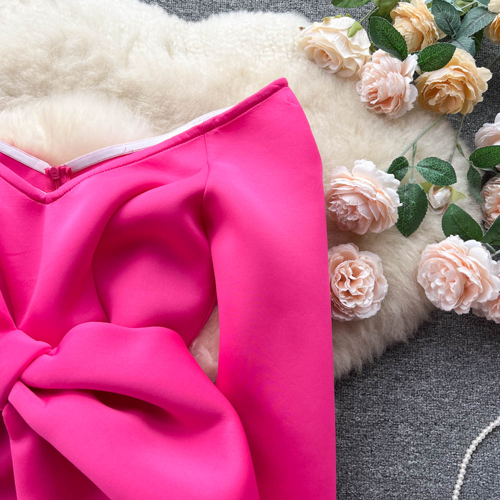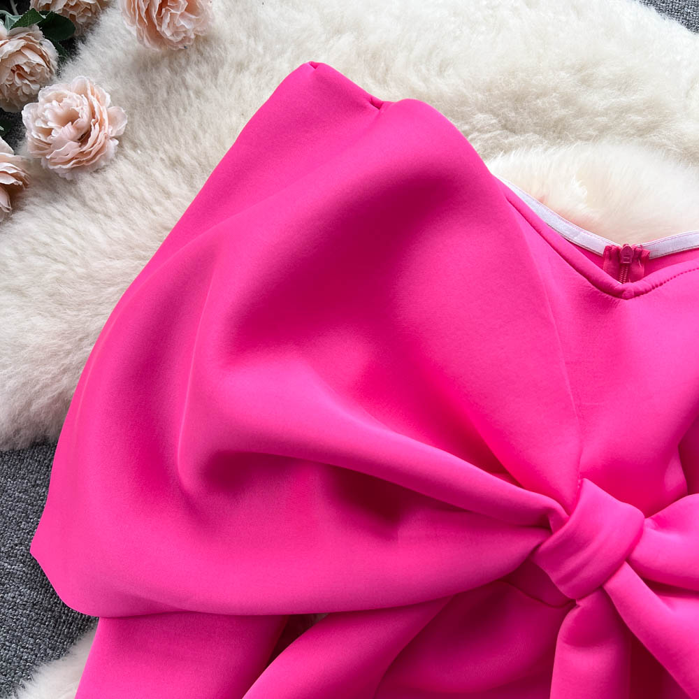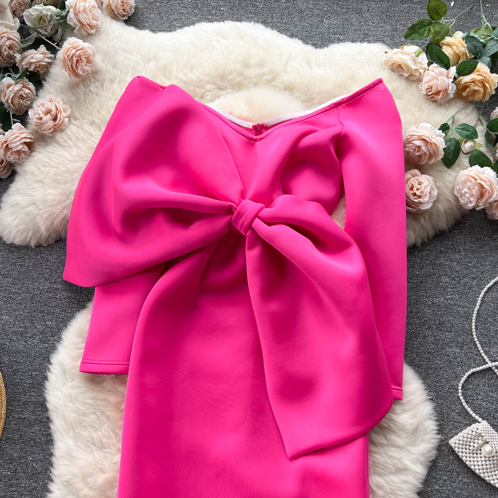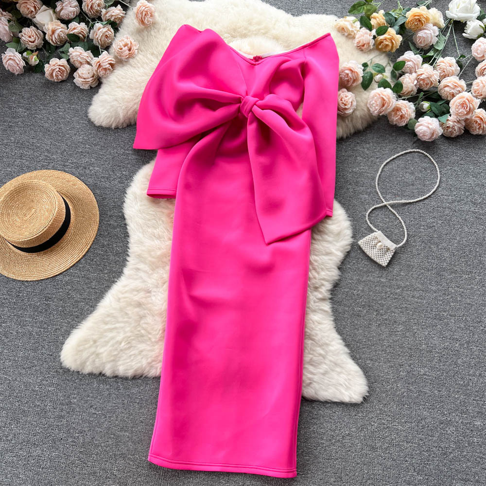 Vintage Vogue Elegant Retro Satin Dress with Boat Neck and Off-Shoulder Bow
