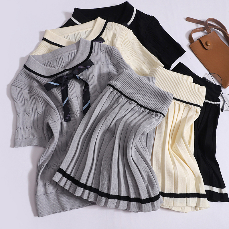 Women's Doll Collar Bow Crop Top With High Waist A-line Pleated Skirt Two-Piece Set
