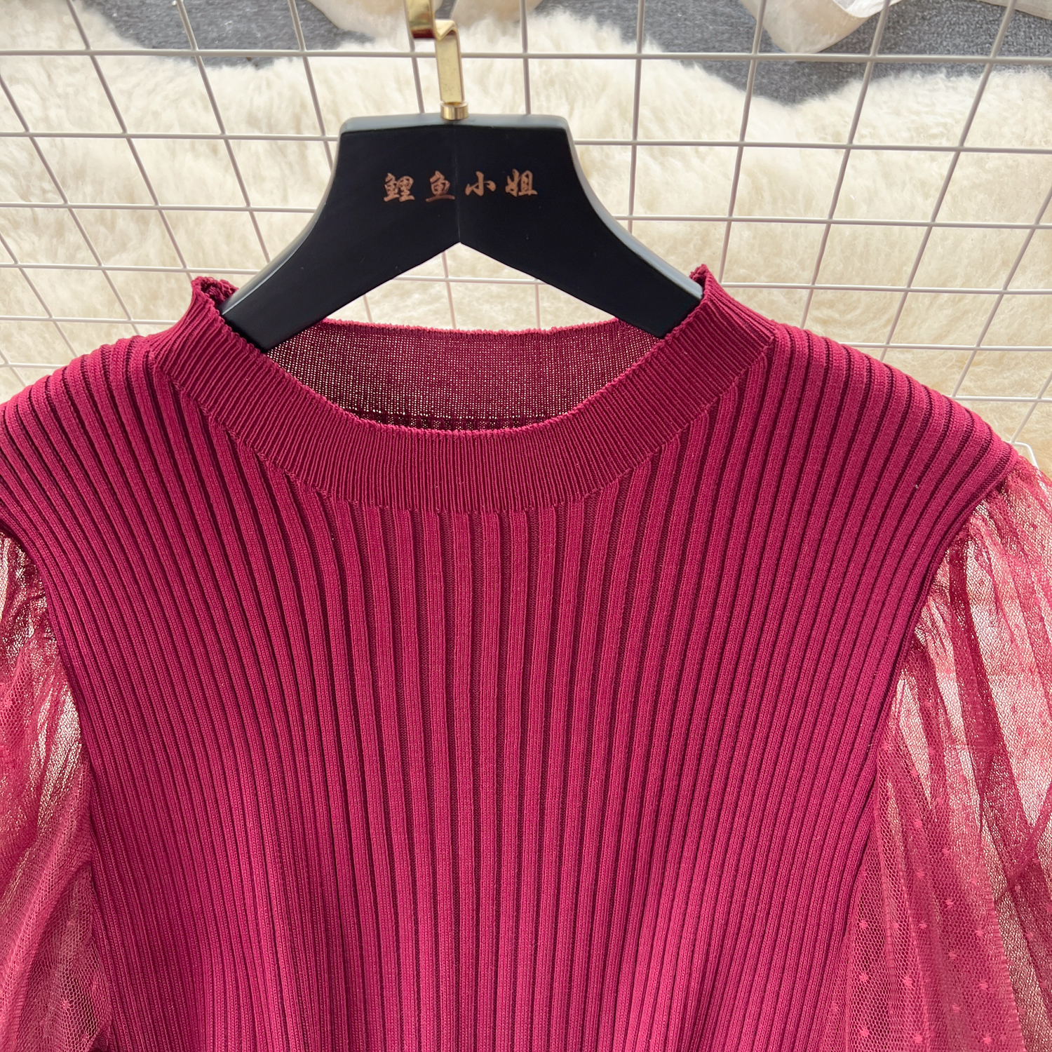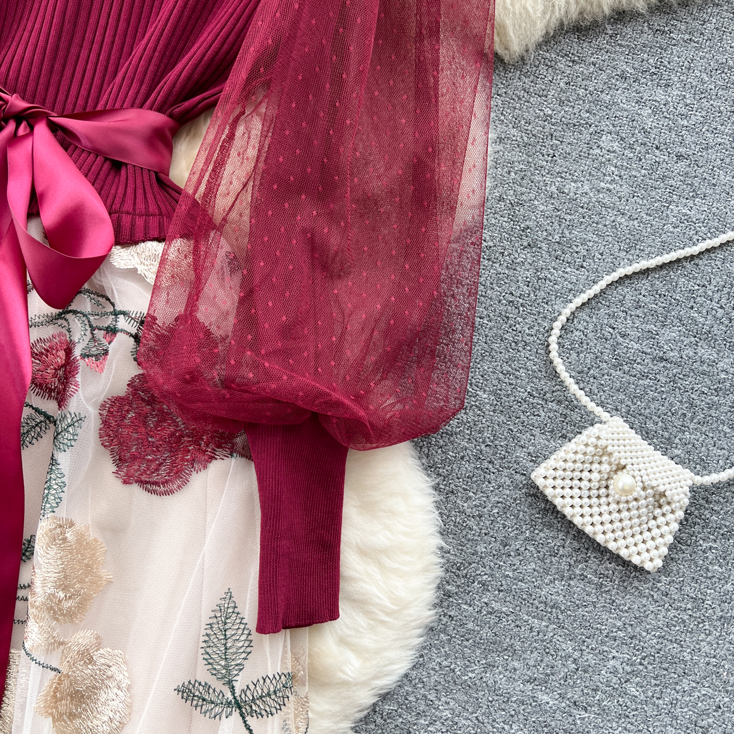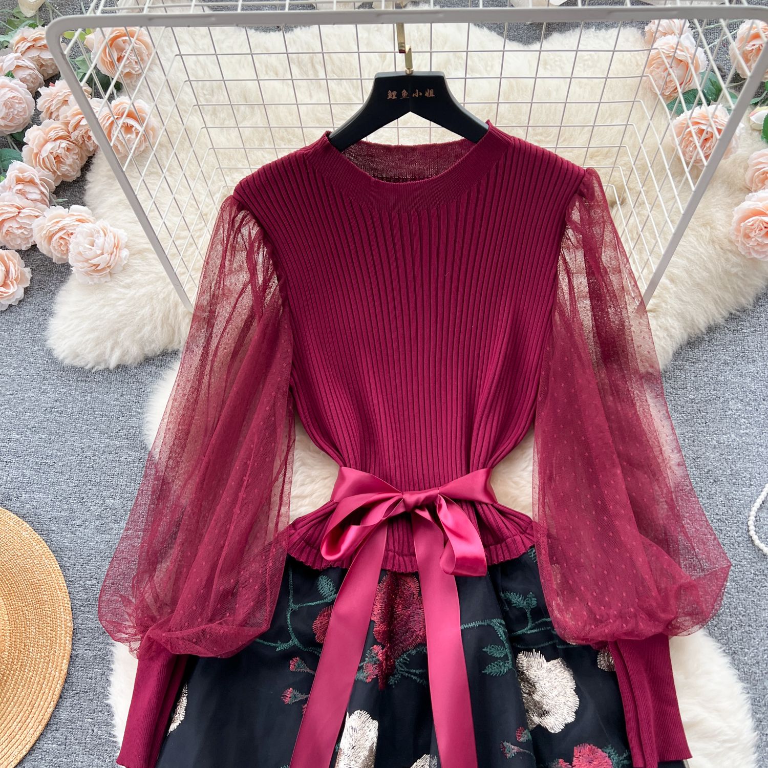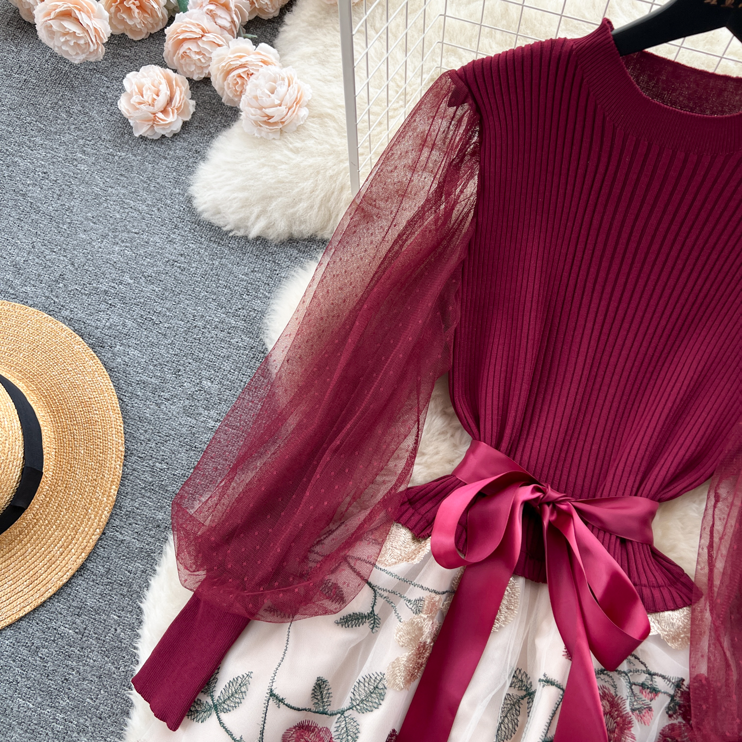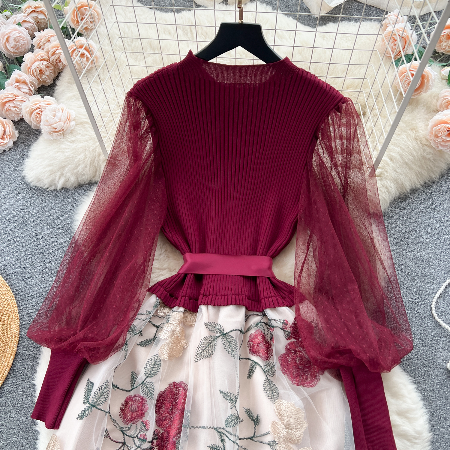 - Material: Soft knitted fabric with net embroidery for an elegant, textured look