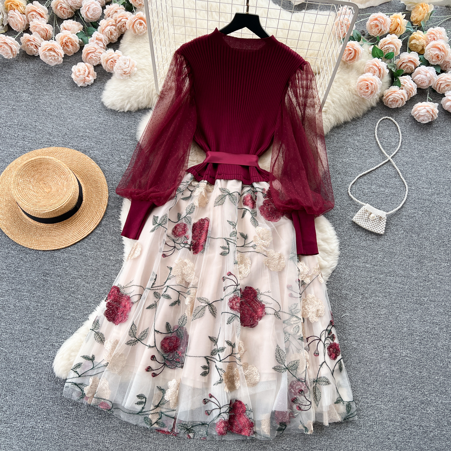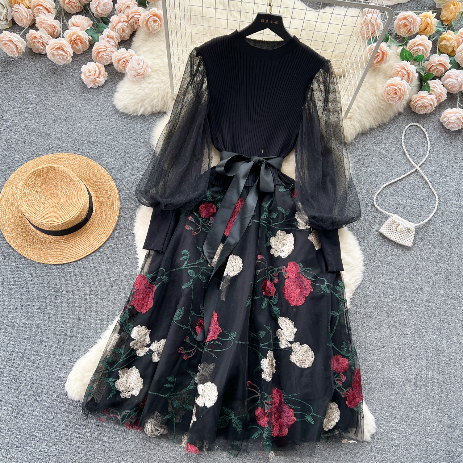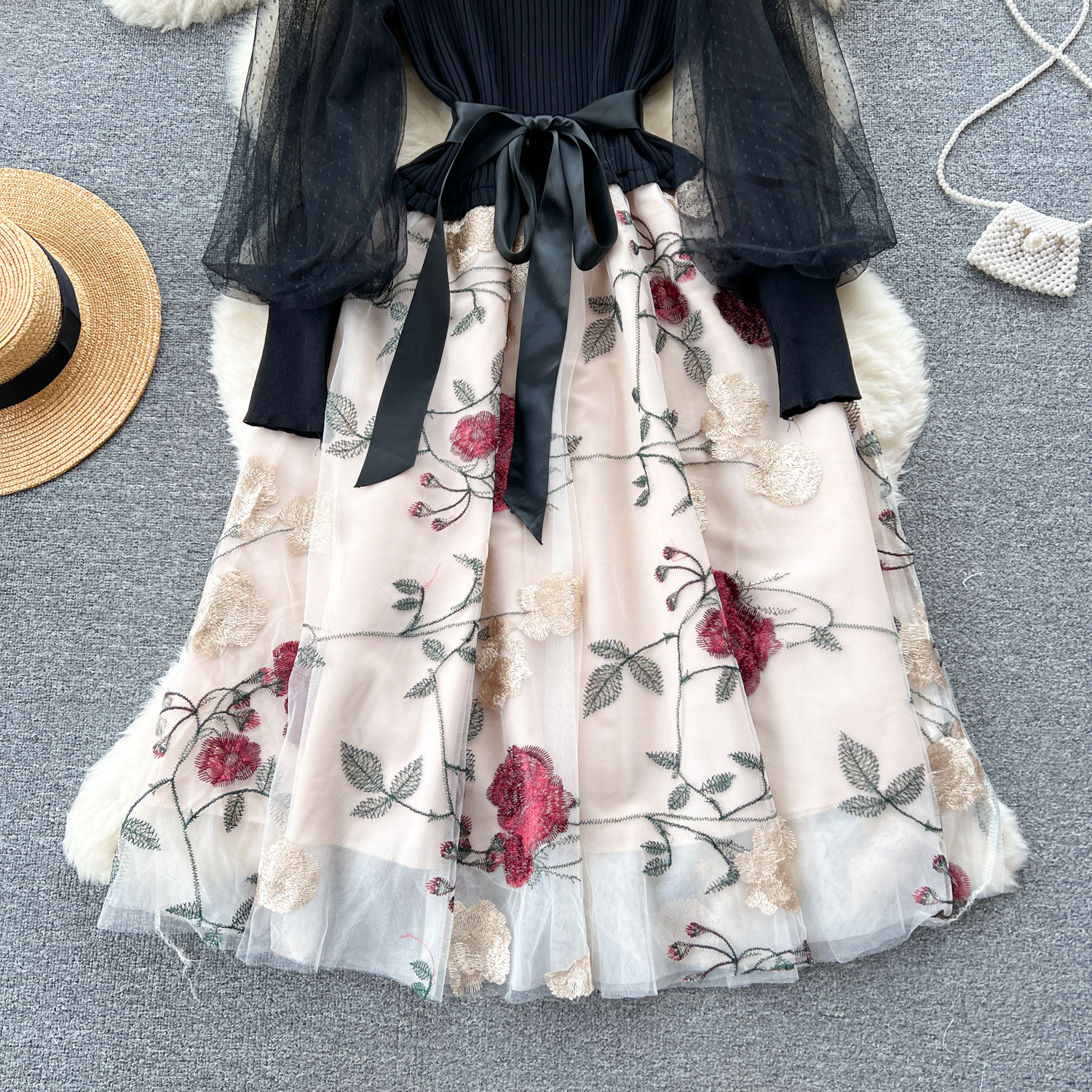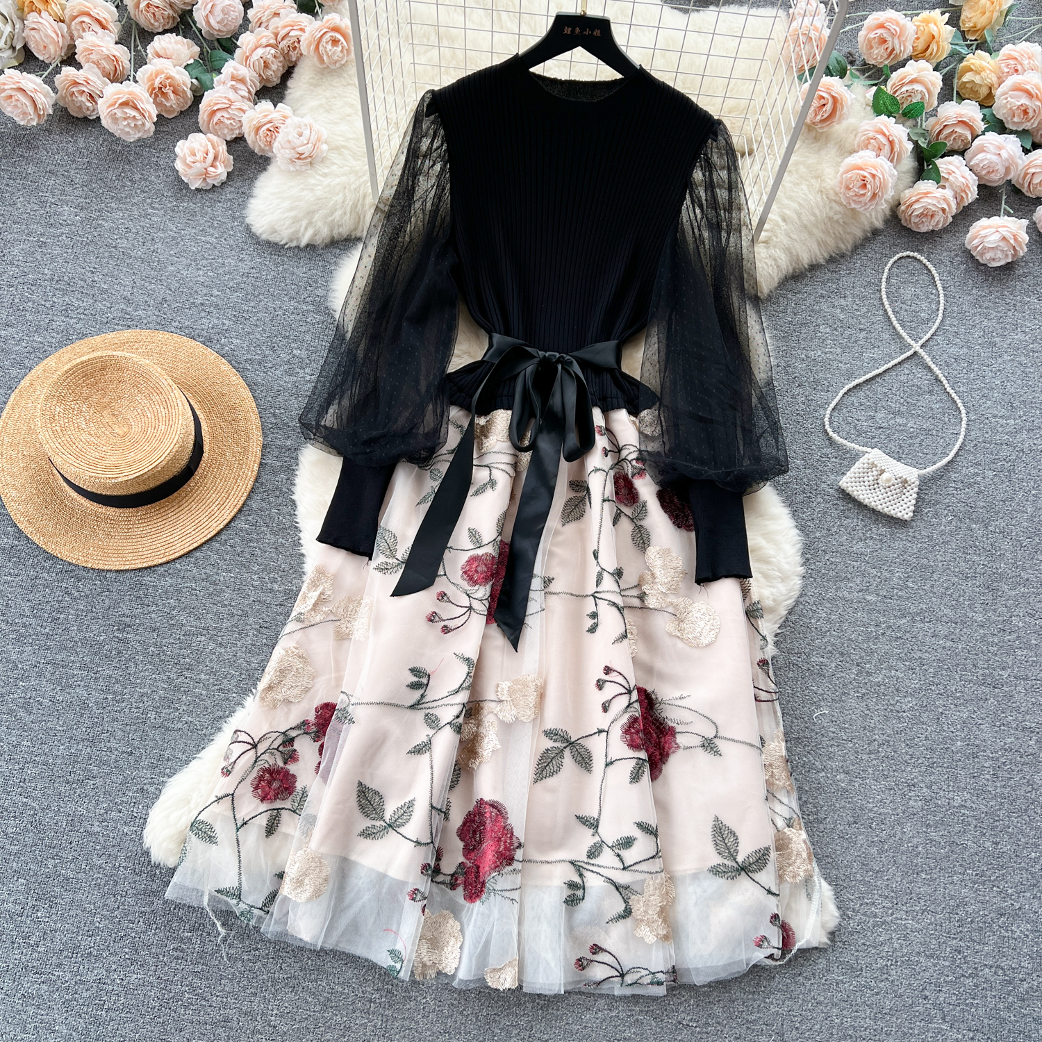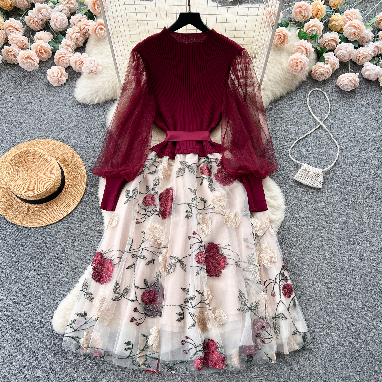 Women's Luxury Style Knitted Stitched Embroidered Mesh Dress With Lace-Up Waist Temperament Fairy Skirt
