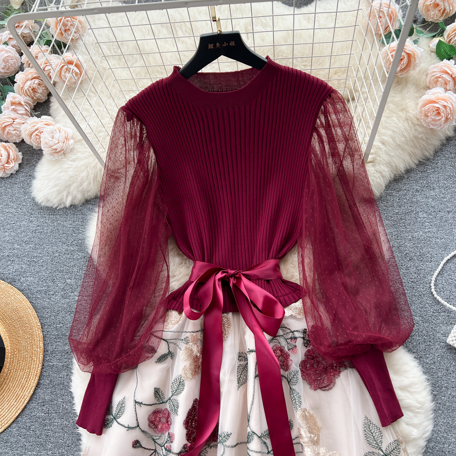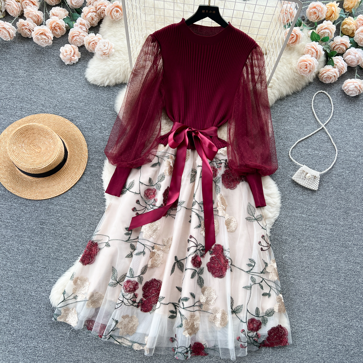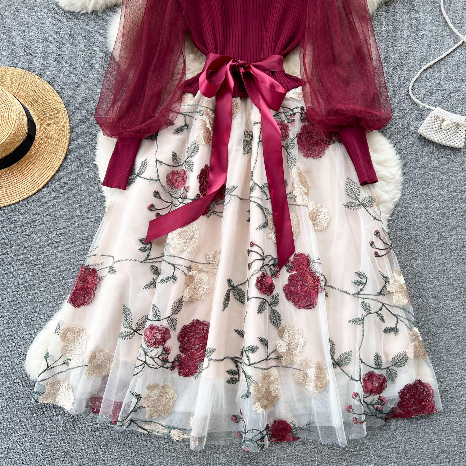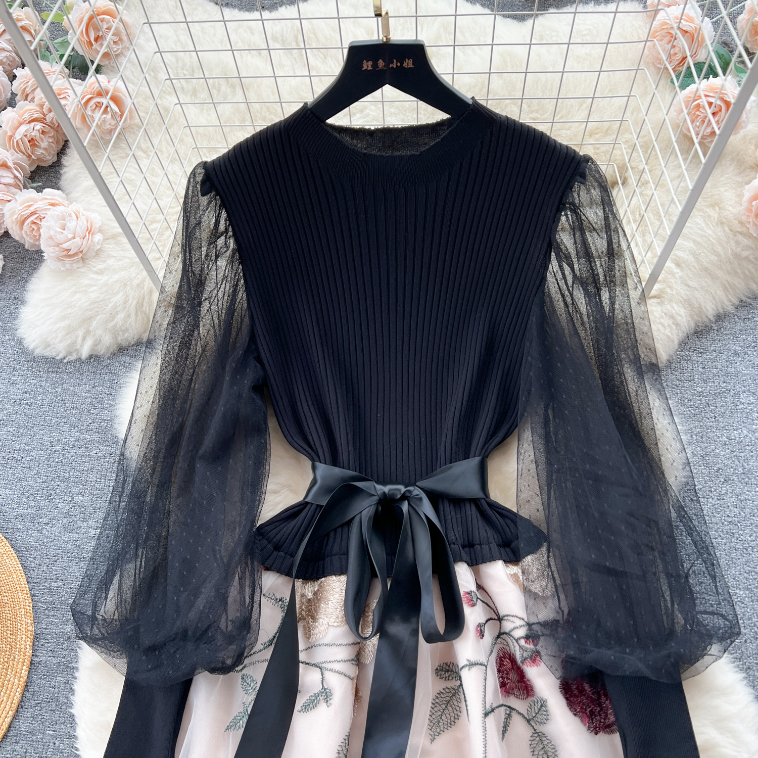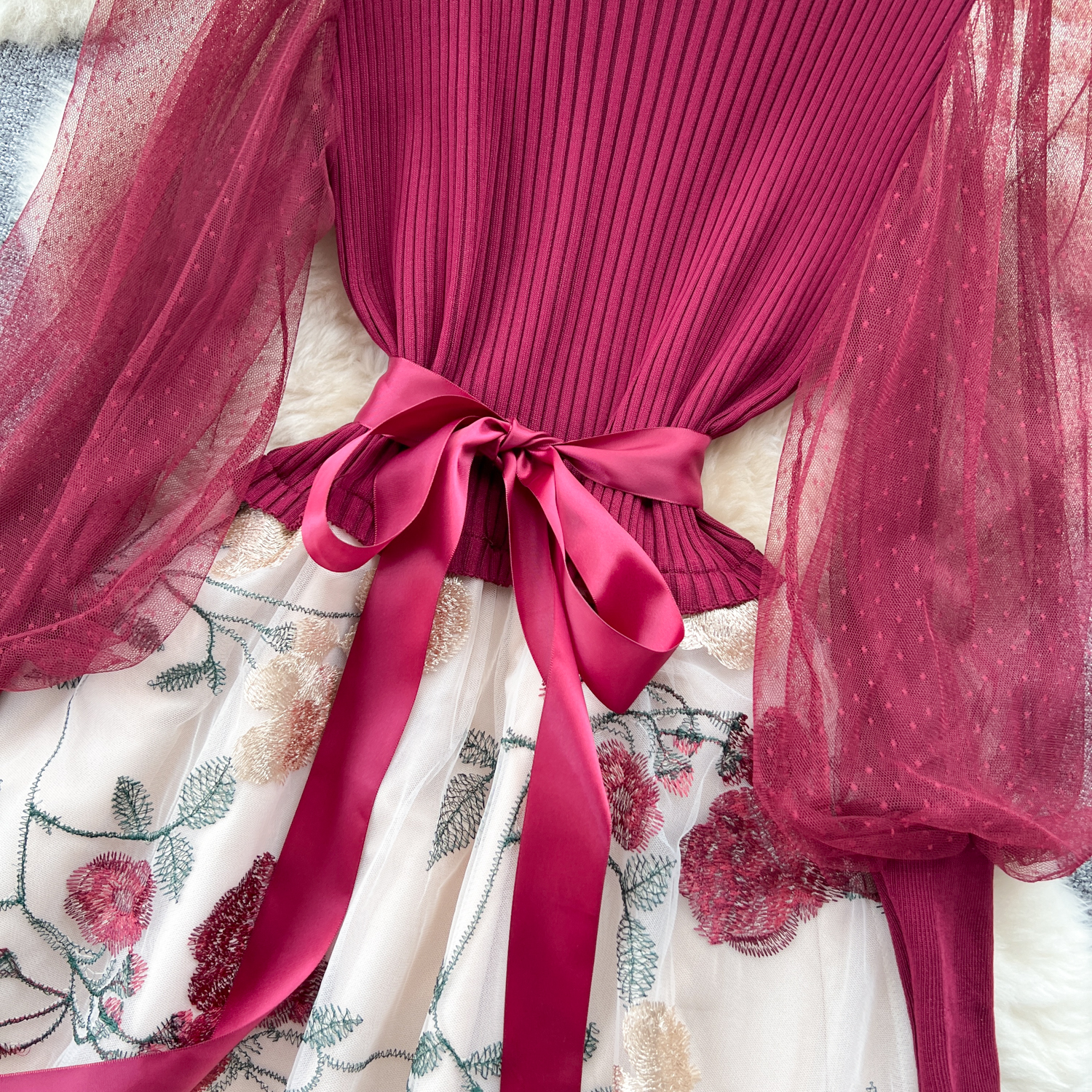 Women's Luxury Style Knitted Stitched Embroidered Mesh Dress With Lace-Up Waist Temperament Fairy Skirt