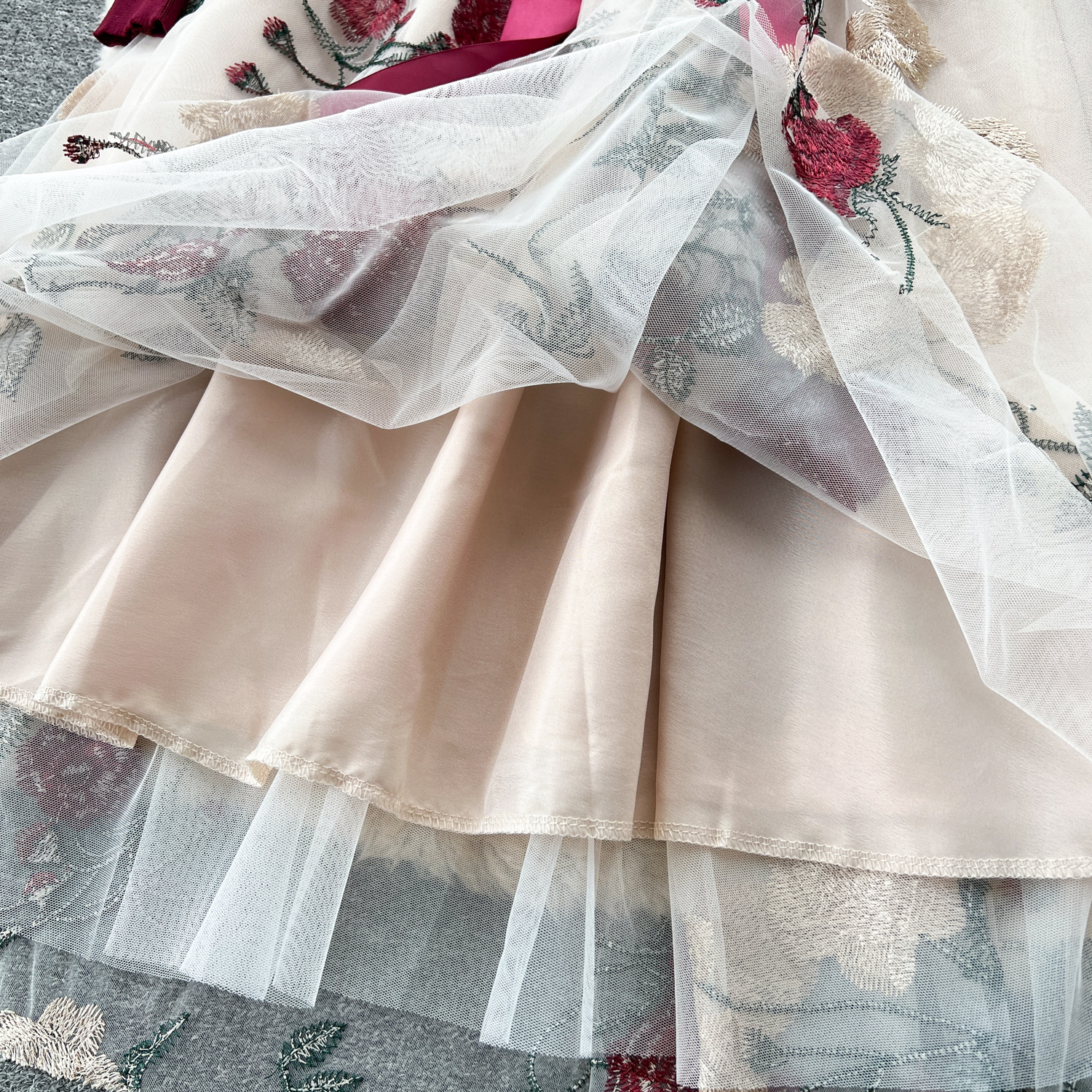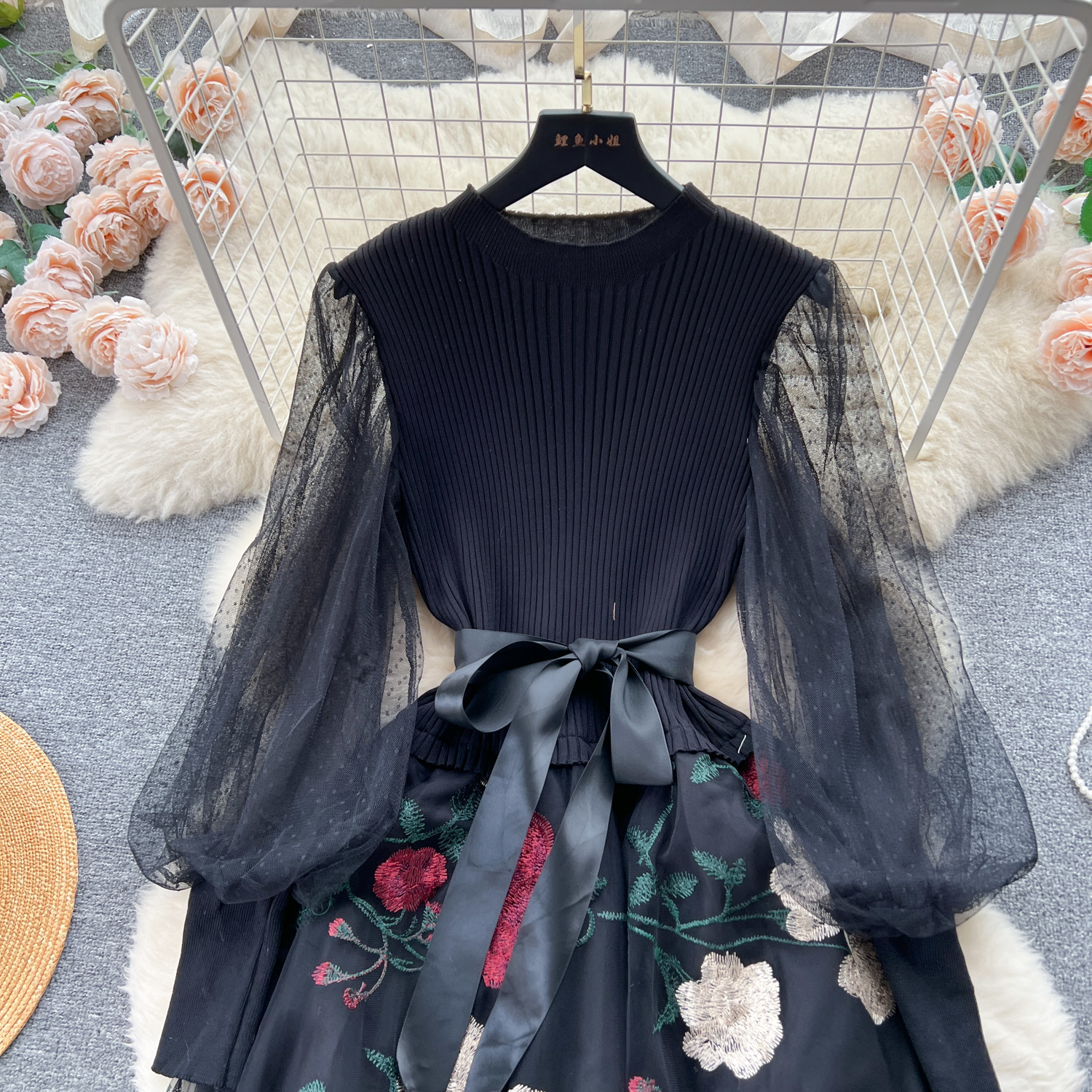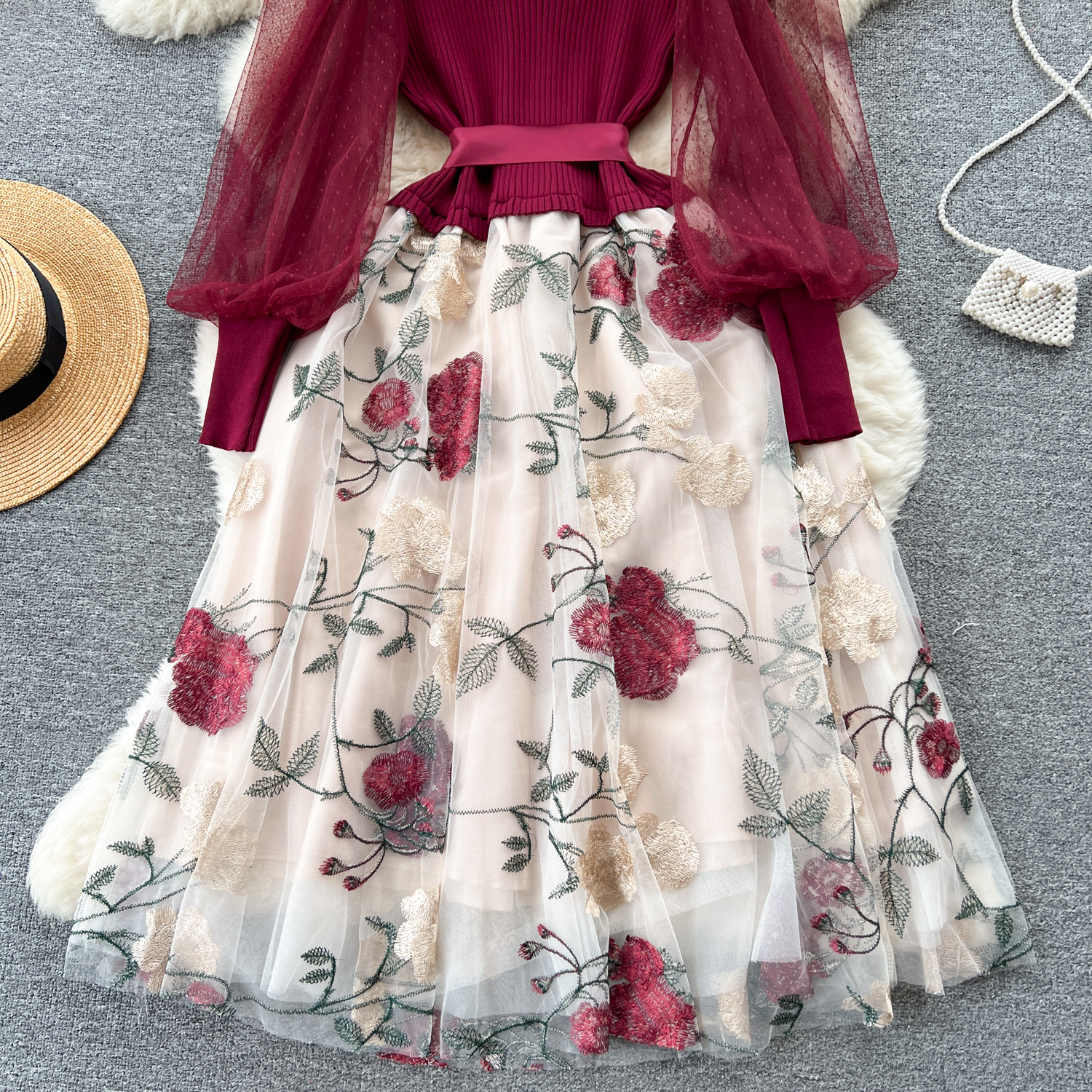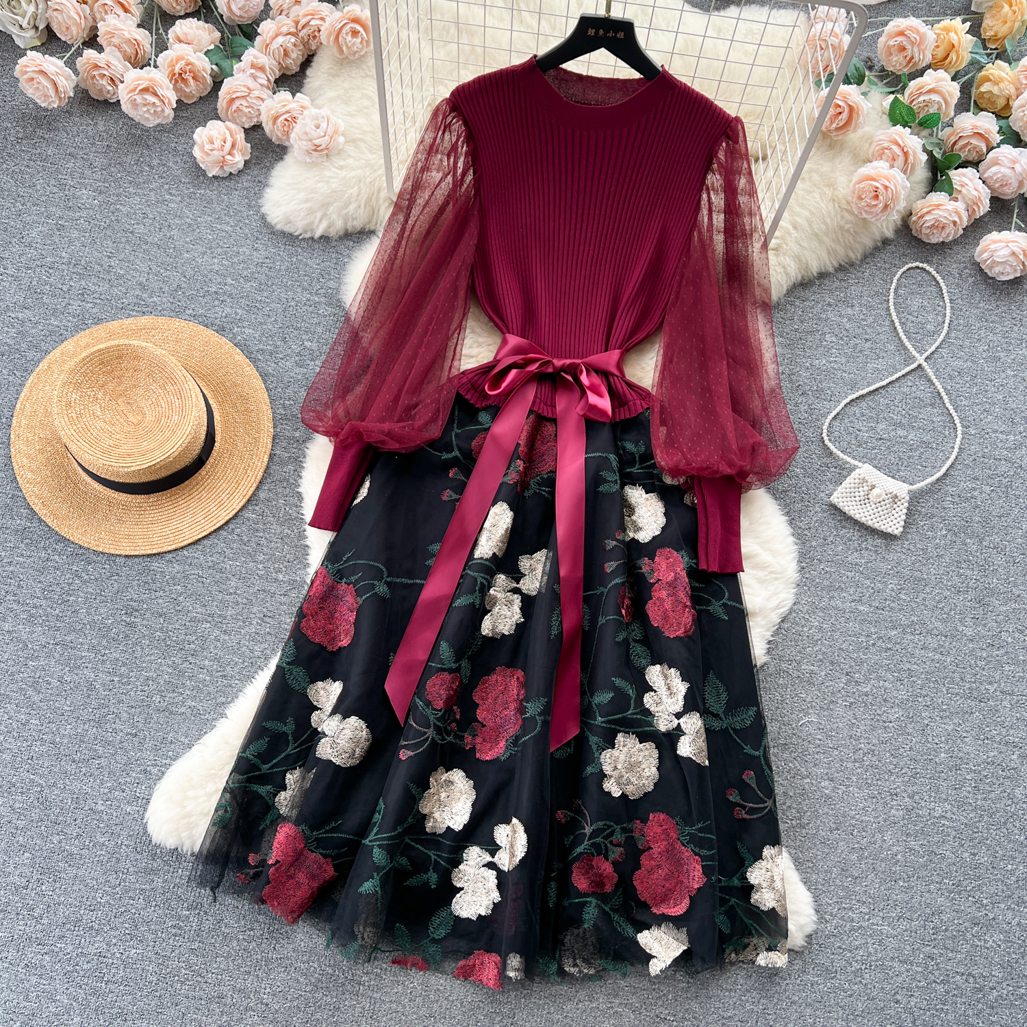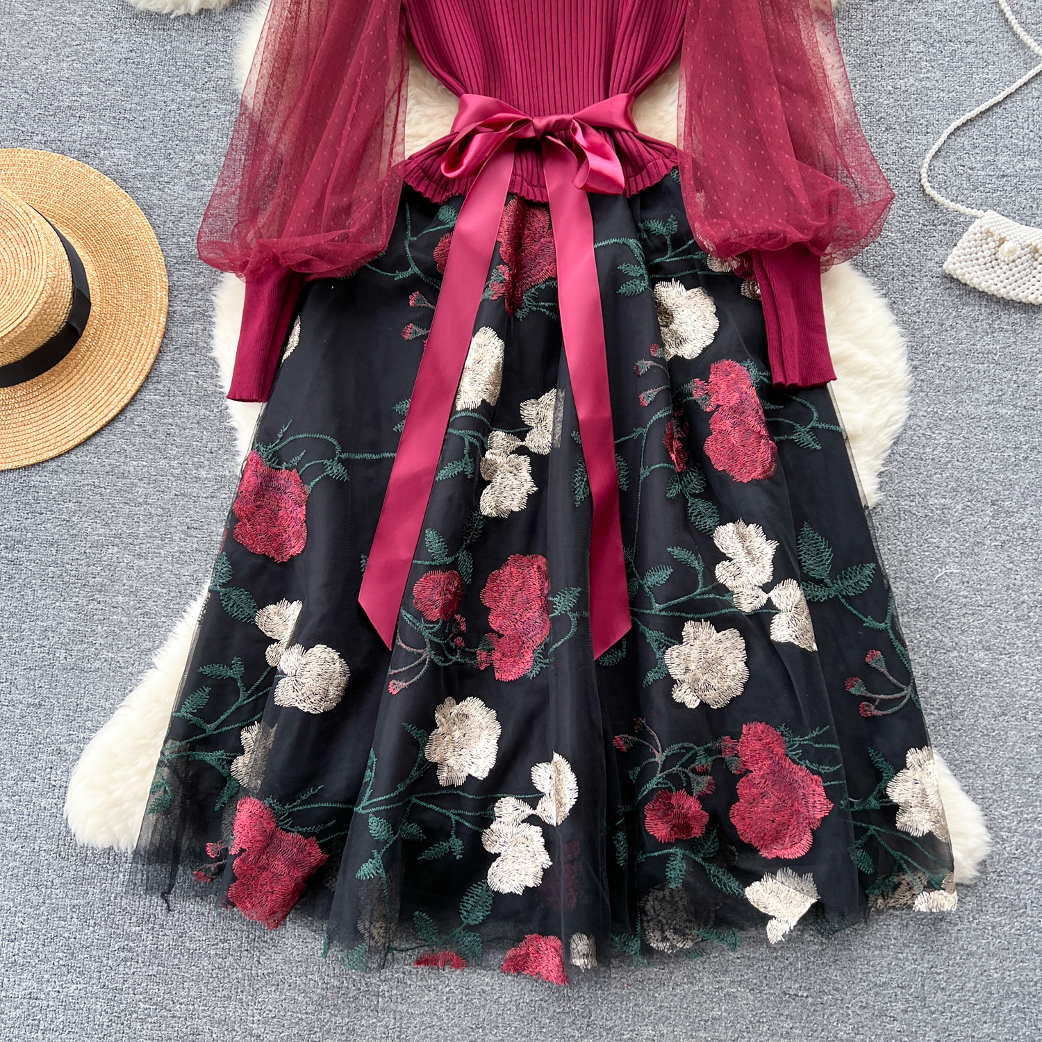 Women's Luxury Style Knitted Stitched Embroidered Mesh Dress With Lace-Up Waist Temperament Fairy Skirt