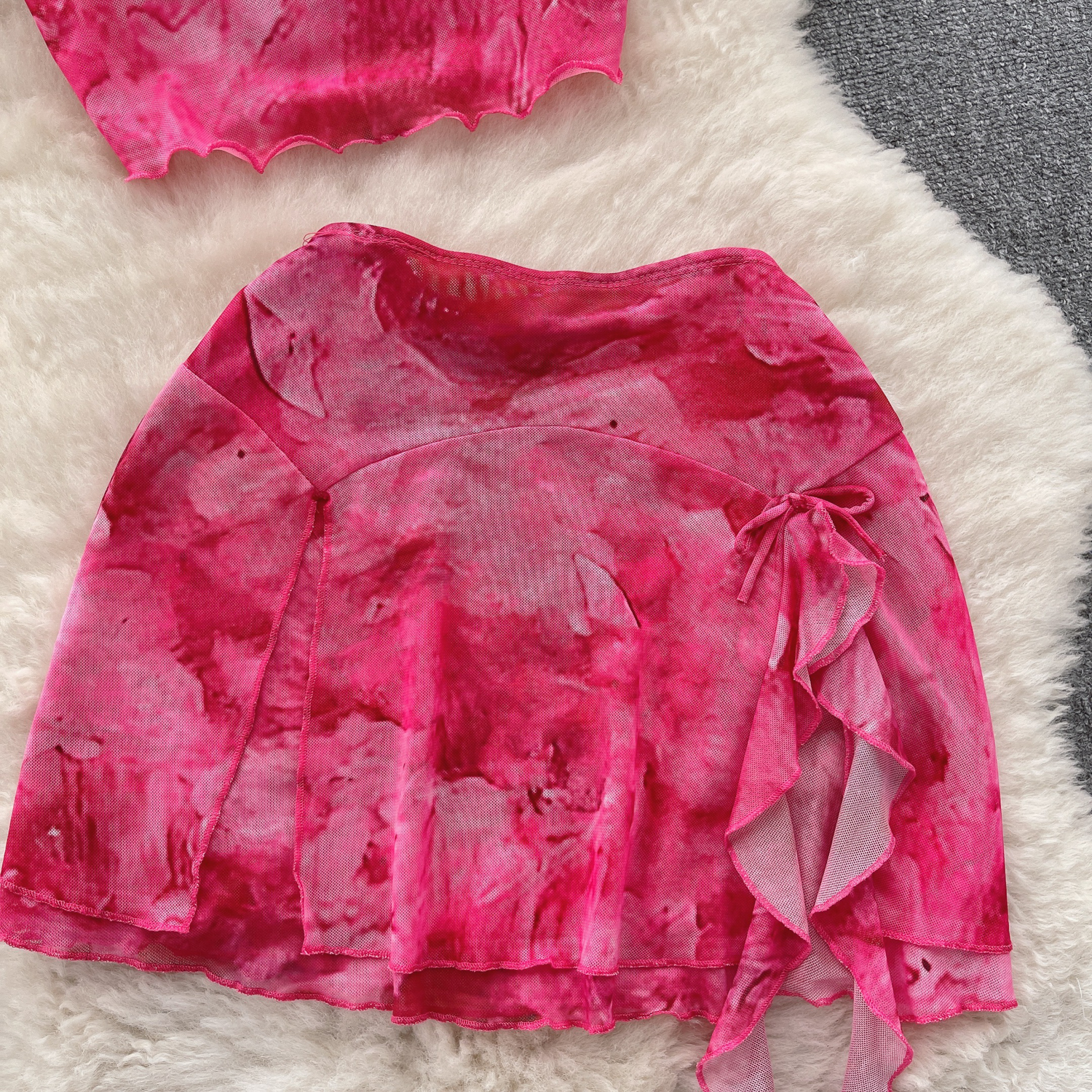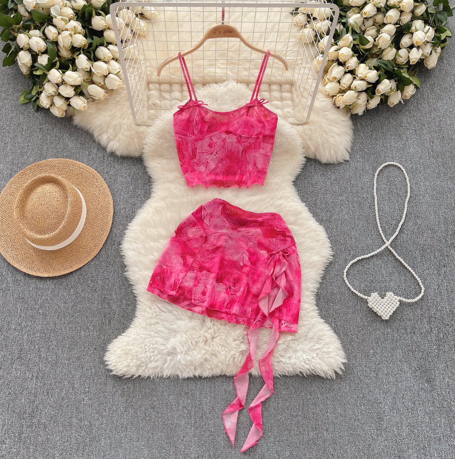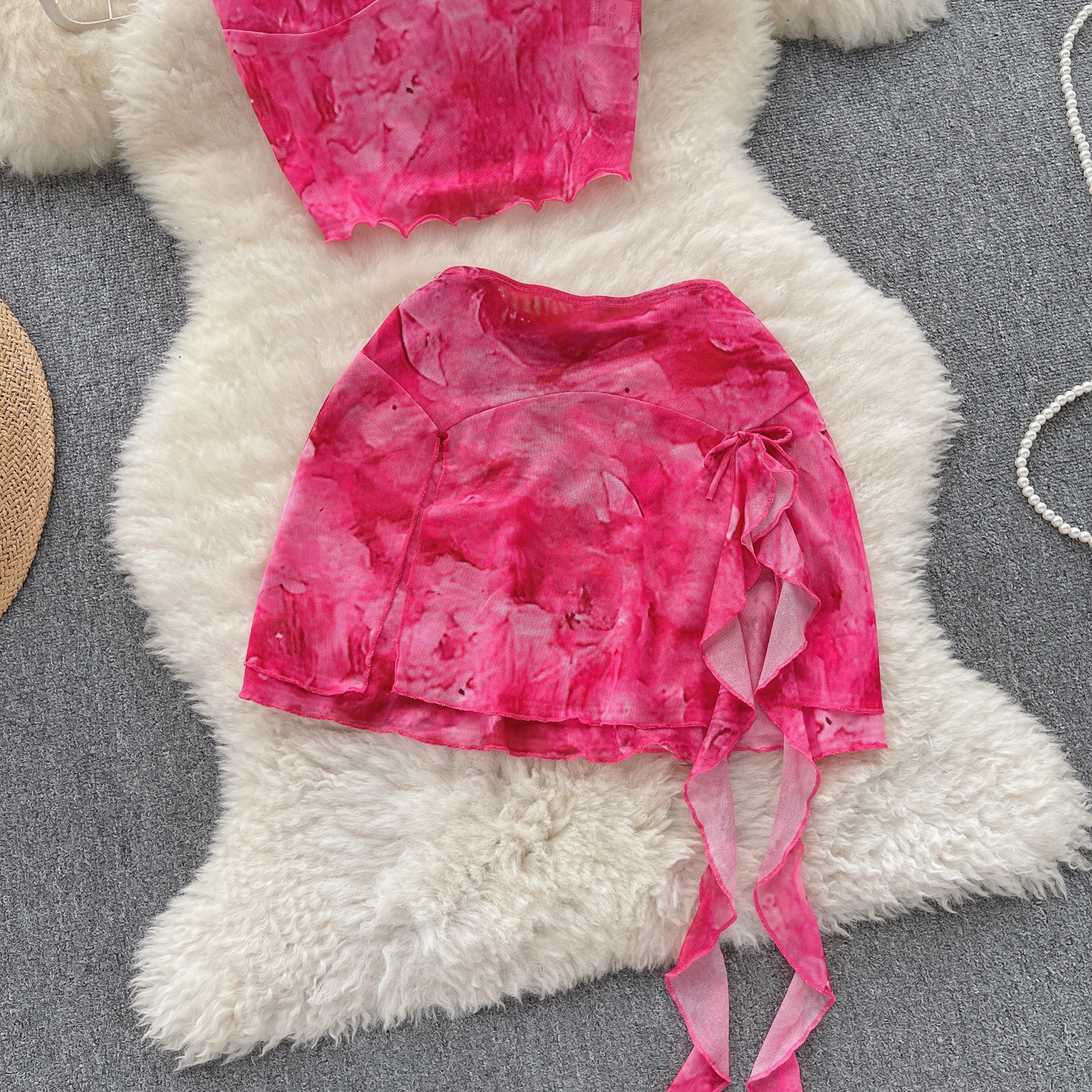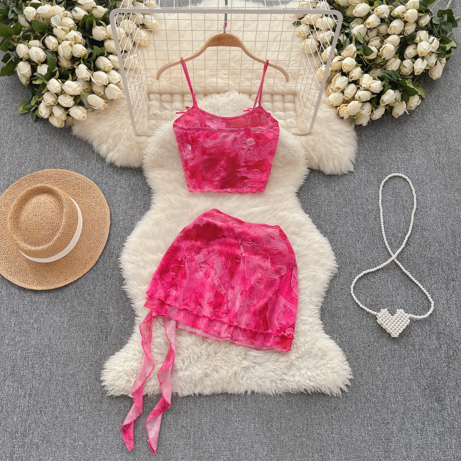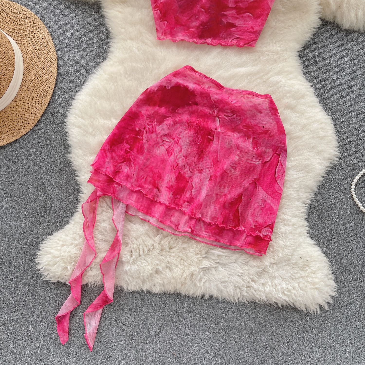 Women's Summer Cool and Spicy Fashion Print Suit Suspender Bandeau Vest & High-waisted Streamer Skirt