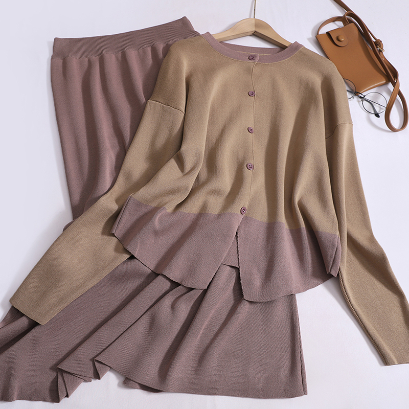 Women's Temperament Solid Color Contrasting Round Neck Long-Sleeved High-Waisted knitted Cardigan Top With Skirt